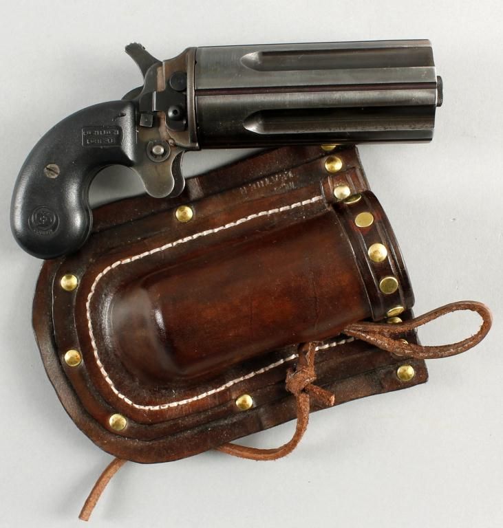 Leinad Mdl MR Cal .45LC SN:103052Rotating barrel 5 shot pepperbox chambered in .45 LC, blued finish with plastic molded grips, barrels are 3.75" and manually rotate, very good bores and action. Includes well made custom leather holster.Condition: Very good showing light holster wear.