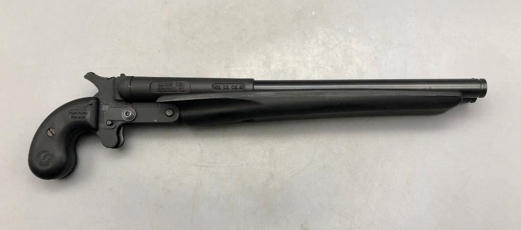 For your consideration we have a Leinad Model D.D. .45 Caliber Pistol with a 10.5 inch barrel in very good condition. Maker: Leinad. Serial No. R00000582. Approx. Age: Fairly Modern. Size: Barrel measures 10-1/2 inches long. Condition: Good, normal wear expected. Please look closely at the pictures - they are an important part of our description. Shipping: There will be a $25 handling / packaging fee for shipping this lot. The actual cost of postage will be added on top of that. BUY IT NOW: If you would like to buy this item now without waiting for the auction to end (this option is only available up to 48 hours before the auction starts to close), the “Buy it Now” price is the high estimate of this lot. If you would like to end the auction early and pay the high estimate (plus applicable fees), please contact us by phone or email and reference this lot number. *****This firearm requires an FFL Transfer*****