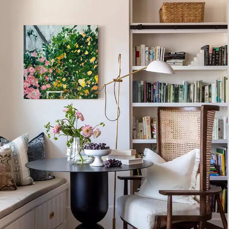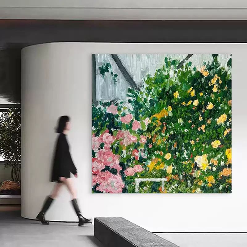 The image depicts a serene garden, with vibrant flowers intertwined, creating an atmosphere of leisure and tranquility. The contrast between the pink and yellow flowers and the green plants evokes a sense of natural vitality and a peaceful way of life. Dimensions: 24 x 24 inches.