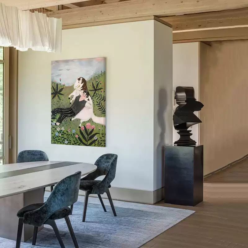 A young man rests against his white horse in a meadow of wildflowers, letting the breeze pass by. The gentle hill and blooming field unfold like a slow afternoon, quiet, carefree, and full of simple joy. Dimensions: 24 x 31 inches.