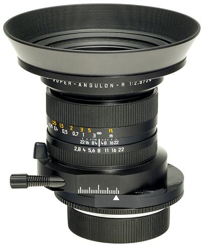 PC-Super-Angulon-R 2,8/28 Leitz, Wetzlar. Nr. 3491767, für ungerahmte Weitwinkelfilter in der 3-teiligen Sonnenblende, flexible Shift-Verstellschraube. Beide Objektivdeckel, Anleitung, Köcher, Karton. - Dabei: Sonnenblende 12540.