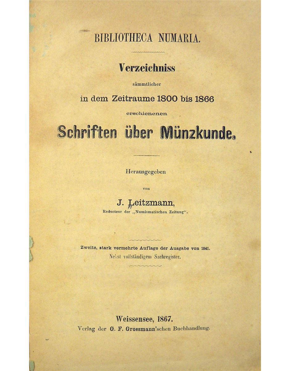 Leitzmann, J. BIBLIOTHECA NUMARIA. VERZEICHNISS SÄMMTLICHER IN DEM ZEITRAUME 1800 BIS 1866 ERSCHIENENEN SCHRIFTEN ÜBER MÜNZKUNDE. Weissensee: Verlag der G. F. Grossman'schen Buchhandlung, 1867. 16mo, contemporary cloth and mottled boards. iv, 189, (1) pages. Light browning. Very good. The indispensable update to Lipsius, still essential. Ex George Fuld library, with his bookplate. Previously in the library of the ANS, also with its bookplate.