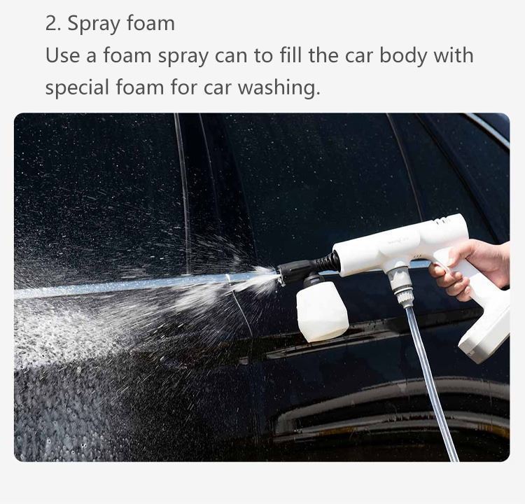 Product Name: Lekong Portable Power Car Washer. Features: This portable power car washer offers substantial water pressure, full waterproofing, and a powerful built-in lithium battery for extended use. Its lightweight design allows easy handling, and it can be connected to either a water bucket or faucet for versatile usage.