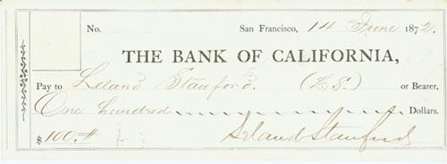 LELAND STANFORD. DS. 1pp. 7 3/4" x 2 3/4". San Francisco. 14 June 1872. A "Bank of California" check signed "Leland Stanford". He paid himself "One hundred Dollars". The piece has one small cut cancellation that does not affect the signature and is in extremely fine condition.
