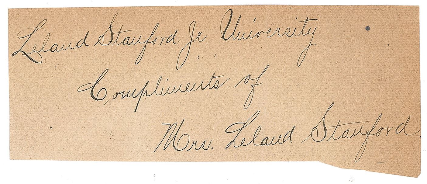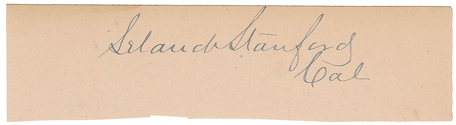 American industrialist and politician (1824–1893) who cofounded the Central Pacific Railroad and later established Stanford University. Ink signature, "Leland Stanford, Cal.,” on an off-white 6.5 x 1.75 slip. Also includes a signature of his wife, "Leland Stanford Jr. University, Compliments of Mrs. Leland Stanford," on an off-white 5.75 x 2.25 slip. In fine condition, with light toning. In 1891, Jane and Leland Stanford established Leland Stanford Jr. University in memory of their only child, who had died of typhoid fever at age 15—today it is more commonly known simply as Stanford University.