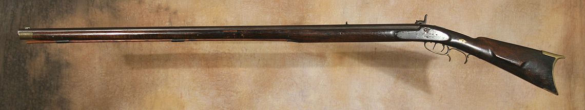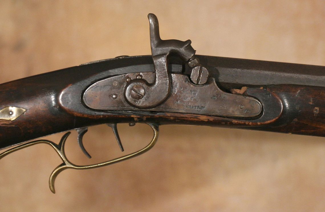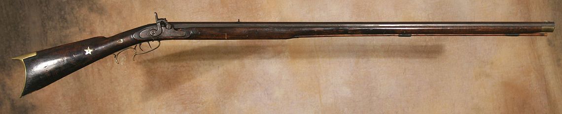 Leman Percussion Long Rifle . 41" octagonal barrel, .30 calibre with set triggers, original sights & inlaid designs. Marked on lock plate. Circa 1850s. (est. 1,000-2,000). CONDITION REPORTS: www.auctioninsantafe.com/docs/cr2012.pdf
