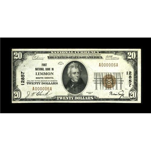 <B>Lemmon, SD</B></I> - $20 1929 Ty. 1 <B>First NB</B></I> Ch. # 12857<BR>An <B>Extremely Fine</B></I> note from Perkins County. Just six of the $20 Ty. 1 have been traced from here.<BR><BR><b>Shipping:</b> Coin/Currency (<a target="_blank" href="http://www.heritageauctions.com/common/shipping.php">view shipping information</a>)