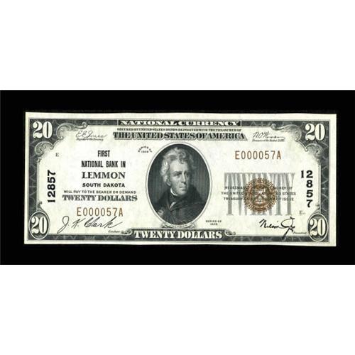 <B>Lemmon, SD</B></I> - $20 1929 Ty. 1 <B>First NB</B></I> Ch. # 12857<BR> A beautiful example which is far higher grade than most notes seen from this not very common state. Bright <B>Choice Crisp Uncirculated.</B></I><BR><BR><b>Shipping:</b> Coins & Currency (<a target="_blank" href="http://www.heritageauctions.com/common/shipping.php">view shipping information</a>)