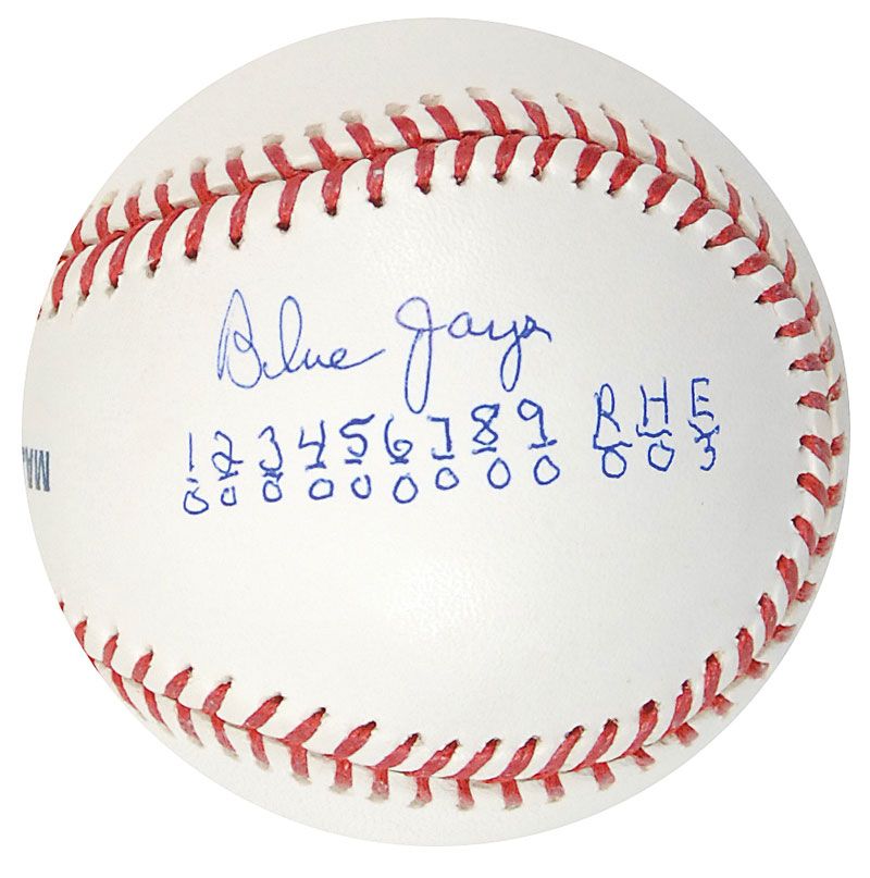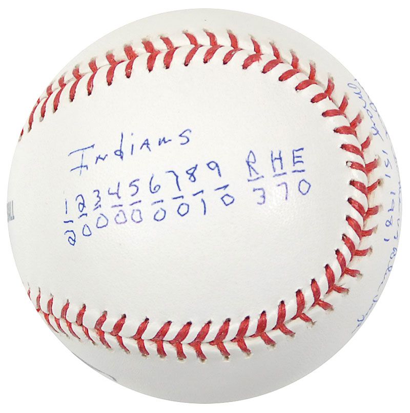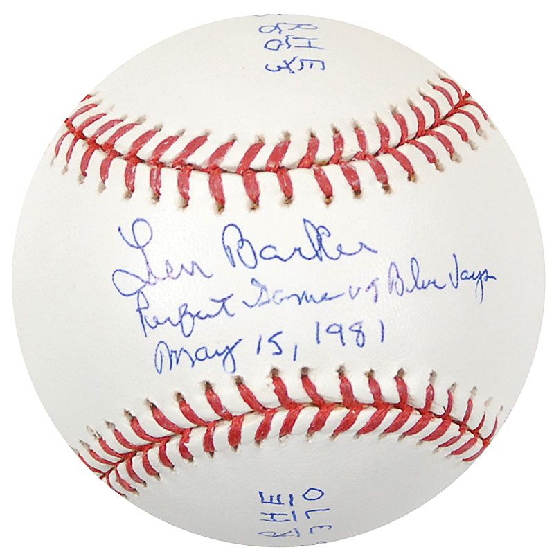 Official Rawlings Major League baseball signed in blue ballpoint on the sweet spot, “Len Barker, perfect Game vs Blue Jays, May 15, 1981,” adding the line scores to two side panels. In fine condition.