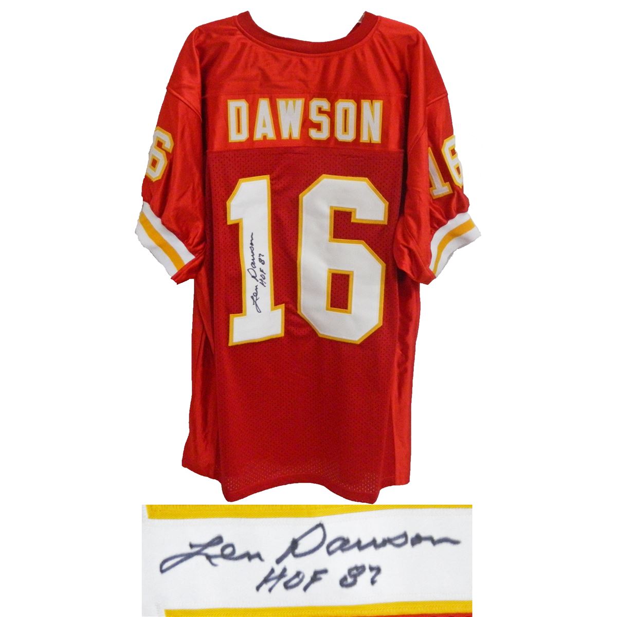 Len Dawson signed custom red and gold jersey with 'HOF'87' inscription. Item comes with a Schwartz Sports Memorabilia tamper-proof numbered hologram and Certificate of Authenticity which can be verified online.