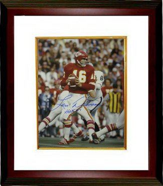 Len Dawson led the Chiefs to victory in Super Bowl IV and won the game's MVP award. Dawson retired from pro football in 1975 and was inducted into the Pro Football Hall of Fame in 1987. He was a 6 Time AFL All-Star selection, a 1 time Pro Bowl selection, a 4 Time All-AFL selection, and a 3 time AFL champion. Len Dawson has hand autographed this Kansas City Chiefs 16x20 Color Photo with HOF 87 inscription. Certificate of Authenticity from Athlon Sports. Custom White Mat and Premium Mahogany Frame as shown.