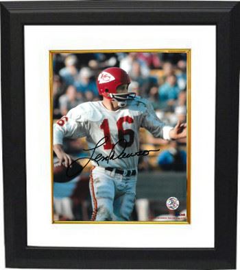 Len Dawson led the Chiefs to victory in Super Bowl IV and won the game's MVP award. Dawson retired from pro football in 1975 and was inducted into the Pro Football Hall of Fame in 1987. He was a 6 Time AFL All-Star selection, a 1 time Pro Bowl selection, a 4 Time All-AFL selection, and a 3 time AFL champion. Len Dawson has hand autographed this Kansas City Chiefs 8x10 Photo. Certificate of Authenticity from Athlon Sports Collectibles. Custom White Mat and Premium Black Color Framed as shown.