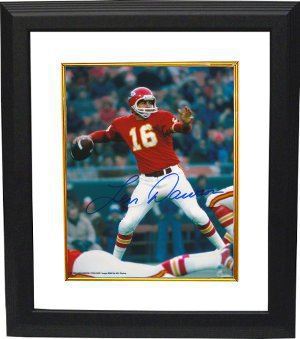 Len Dawson led the Chiefs to victory in Super Bowl IV and won the game's MVP award. Dawson retired from pro football in 1975 and was inducted into the Pro Football Hall of Fame in 1987. He was a 6 Time AFL All-Star selection, a 1 time Pro Bowl selection, a 4 Time All-AFL selection, and a 3 time AFL champion. Len Dawson has hand autographed this autographed Kansas City Chiefs 8x10 Photo. Custom White Mat and Premium Black Color Frame. Certificate of Authenticity from Athlon Sports.