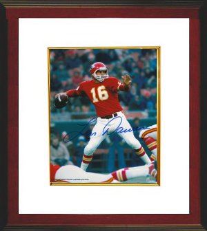 Len Dawson led the Chiefs to victory in Super Bowl IV and won the game's MVP award. Dawson retired from pro football in 1975 and was inducted into the Pro Football Hall of Fame in 1987. He was a 6 Time AFL All-Star selection, a 1 time Pro Bowl selection, a 4 Time All-AFL selection, and a 3 time AFL champion. Len Dawson has hand autographed this autographed Kansas City Chiefs 8x10 Photo. Custom White Mat and Premium Wood Color Frame. Certificate of Authenticity from Athlon Sports.