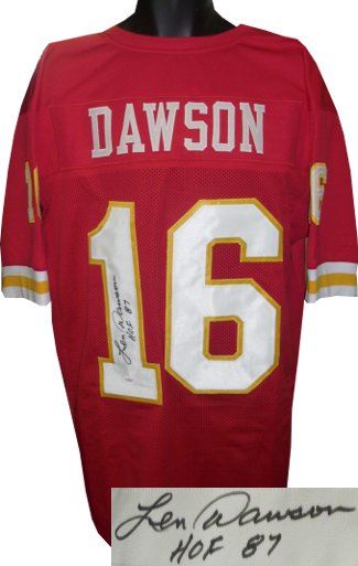 Len Dawson led the Chiefs to victory in Super Bowl IV and won the game's MVP award. Dawson retired from pro football in 1975 and was inducted into the Pro Football Hall of Fame in 1987. He was a 6 Time AFL All-Star selection, a 1 time Pro Bowl selection, a 4 Time All-AFL selection, and a 3 time AFL champion. Len Dawson has hand autographed this Kansas City Chiefs Red TB ProStyle Jersey with HOF 87 Inscription. James Spence Hologram and Certificate of Authenticity from Athlon Sports.
