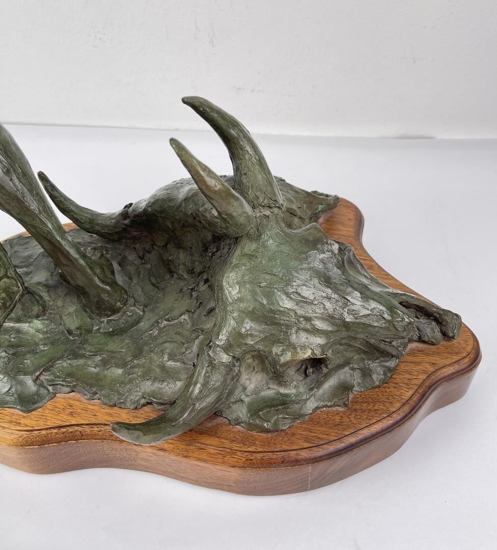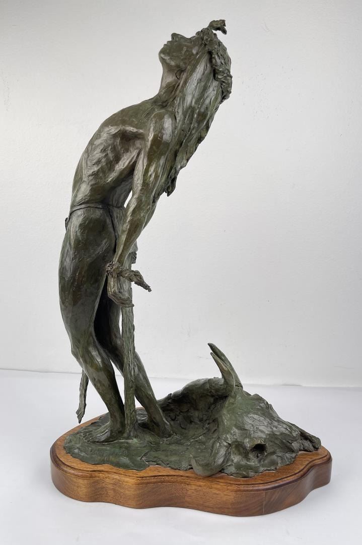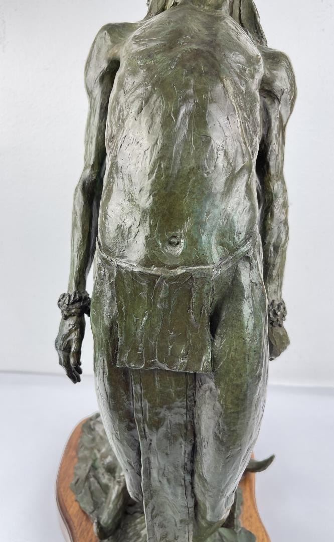Very nice large and poignant bronze. Artist is Len McCann. 27" tall, 17.25" wide. Len graduated from Rocky Mountain School of Art in Denver, Colorado in 1969. Len's emphasis was in commercial art. His experience as a sculptor began at Bunn Studios and later employment at Denver's Natural History Museum in 1971 and naturally proceeded to his own studio. His special emphasis is on the horse and the historical characters who rode them. Len’s work is in many public and private collections, with several of his bronzes owned and displayed by the U.S. Cavalry Museum at Fort Riley Kansas, which is considered by Len to be the ultimate complement to his work. Completed works range in size from miniature to life-size and encompass many fields of interest. Len's specialties include Military History, Equestrian subjects, and miniature one-of-a-kind sculptures that are worked combining mediums and replicating accoutrements.