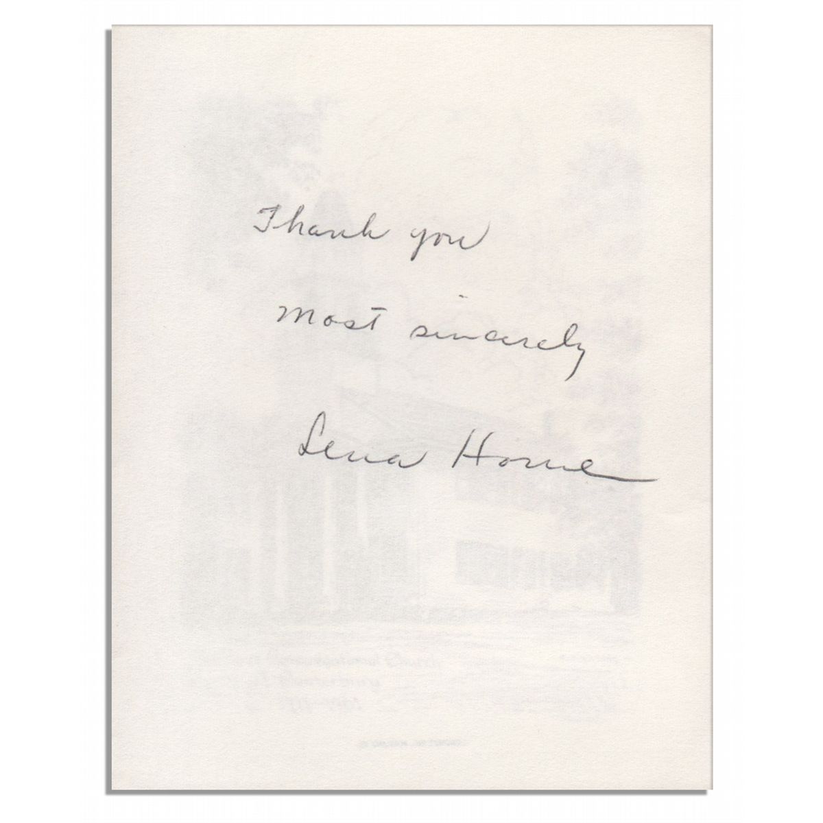 Lena Horne signed card. The multiple Grammy winner was a key public figure for the advancement of the Civil Rights movement. Her autograph inscription to the card reads: ''Thank you / most sincerely / Lena Horne''. Measures 4'' x 5''. Fine.
