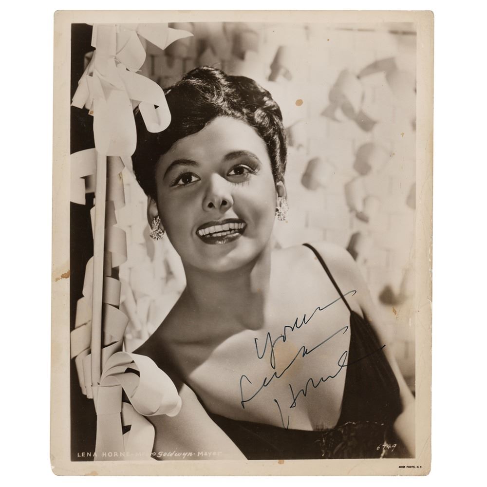 Glossy 8 x 10 MGM photo of the popular singer-actress, signed in black felt tip, "Yours, Lena Horne." In very good condition, with overall creasing and scattered stains.