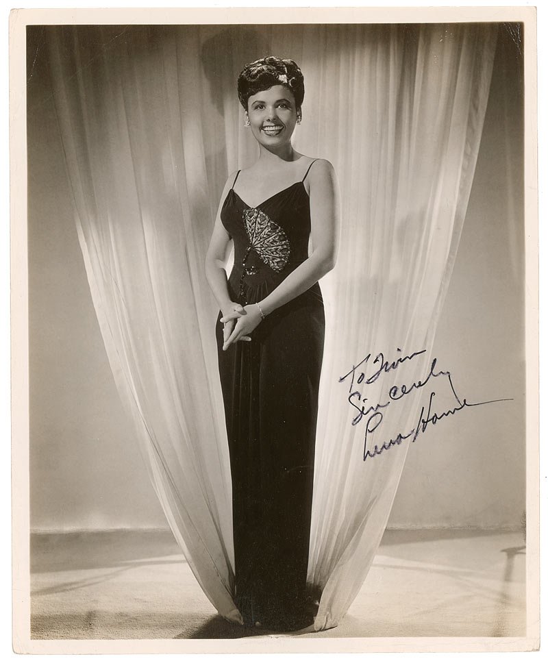 Vintage glossy 8 x 10 MGM publicity photo for Horne’s upcoming film Ziegfeld Follies, credited on the reverse to Willinger, signed and inscribed later in black felt tip “To Irvin, Sincerely, Lena Horne.” In very good condition, with brushing to first name of signature and inscription, scattered creases, mainly to top left, and light surface marks and impressions.