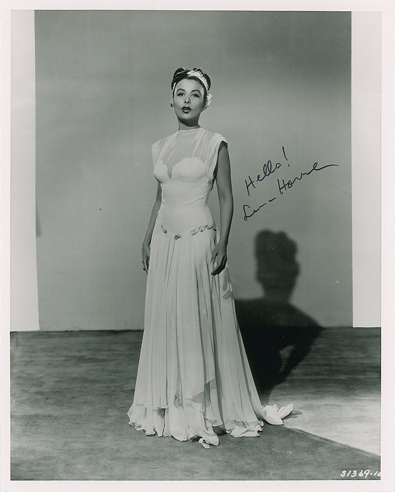 Pretty glossy 8 x 10 full-length photo of Horne in a long dress, signed in black felt tip, “Hello! Lena Horne.” In fine condition, with a paperclip impression to the left edge and a couple mild bends.
