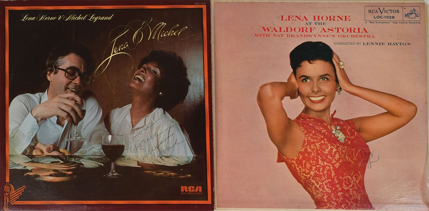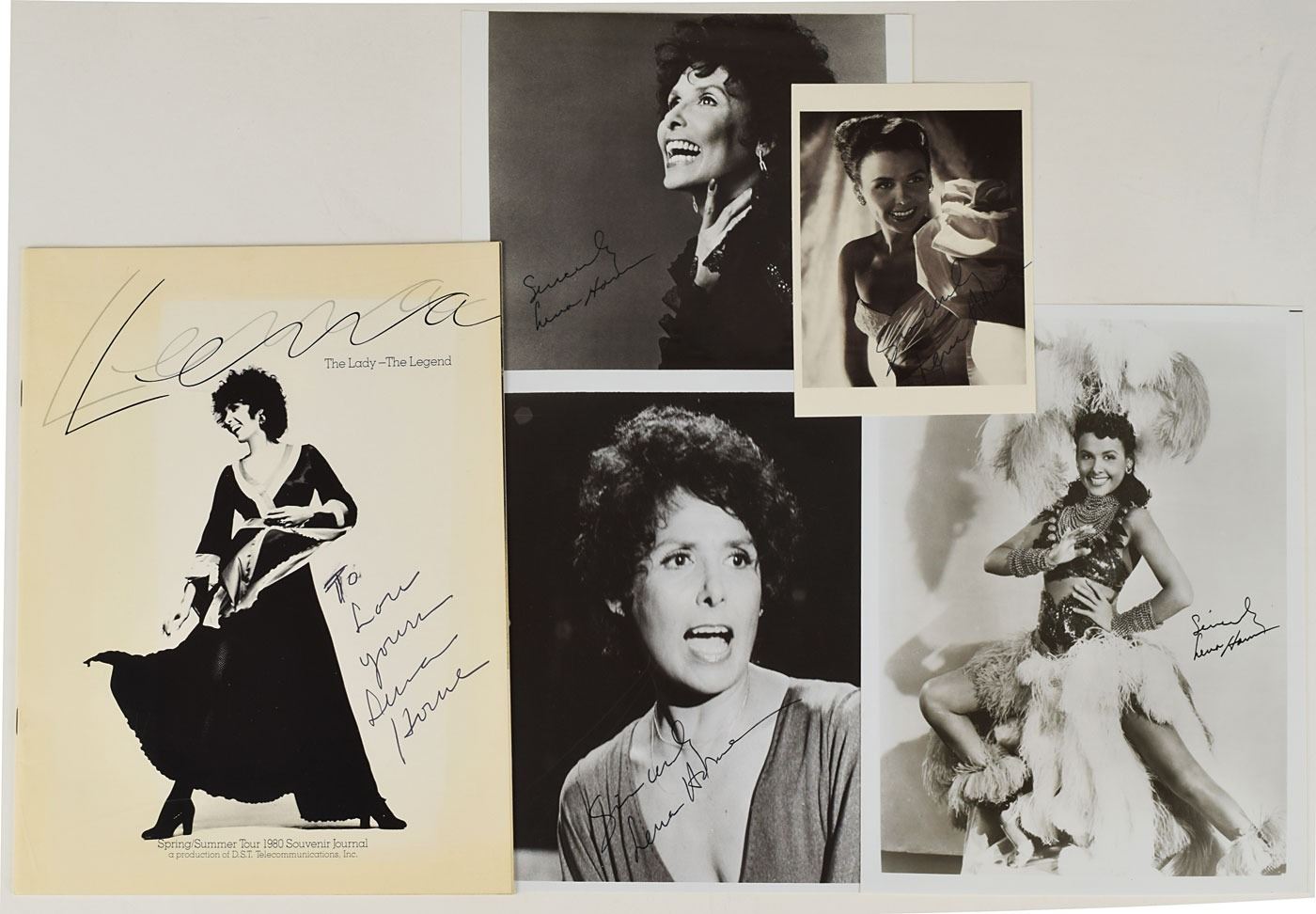 Collection of seven items signed in thin black felt tip by Lena Horne, including: a program for Lena: The Lady—The Legend (ins); two albums (Lena Horne at the Waldorf Astoria and Lena & Michel), both of which are inscribed to “Lou”; and a set of four photos, glossy and semi-glossy, ranging in size from 4.25 x 6 to 8 x 10, which depict Horne at various stages of her career. In overall fine condition. The records are included.