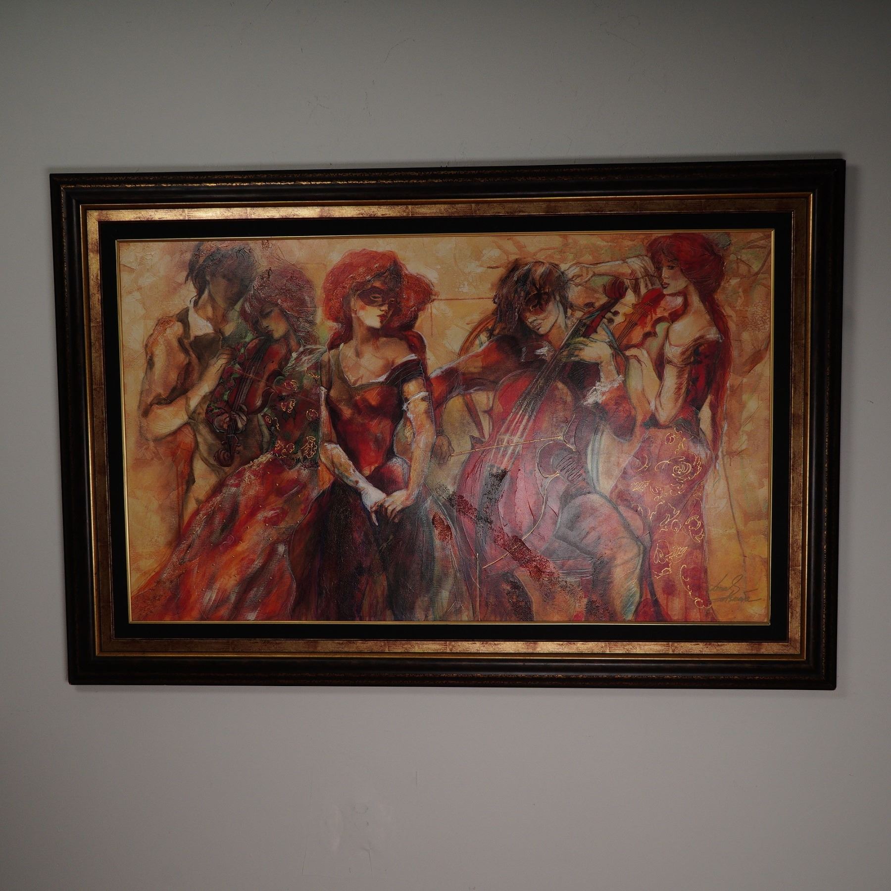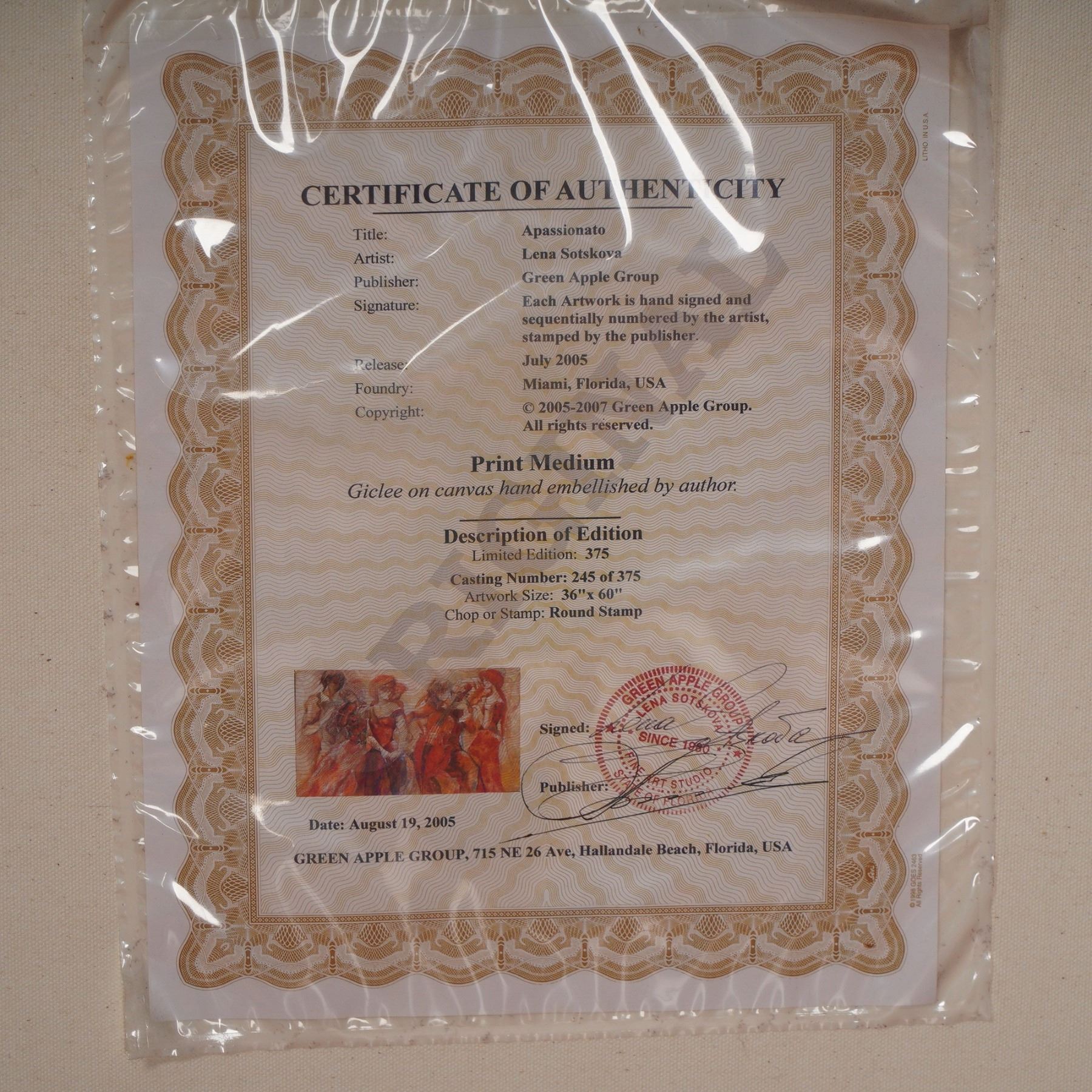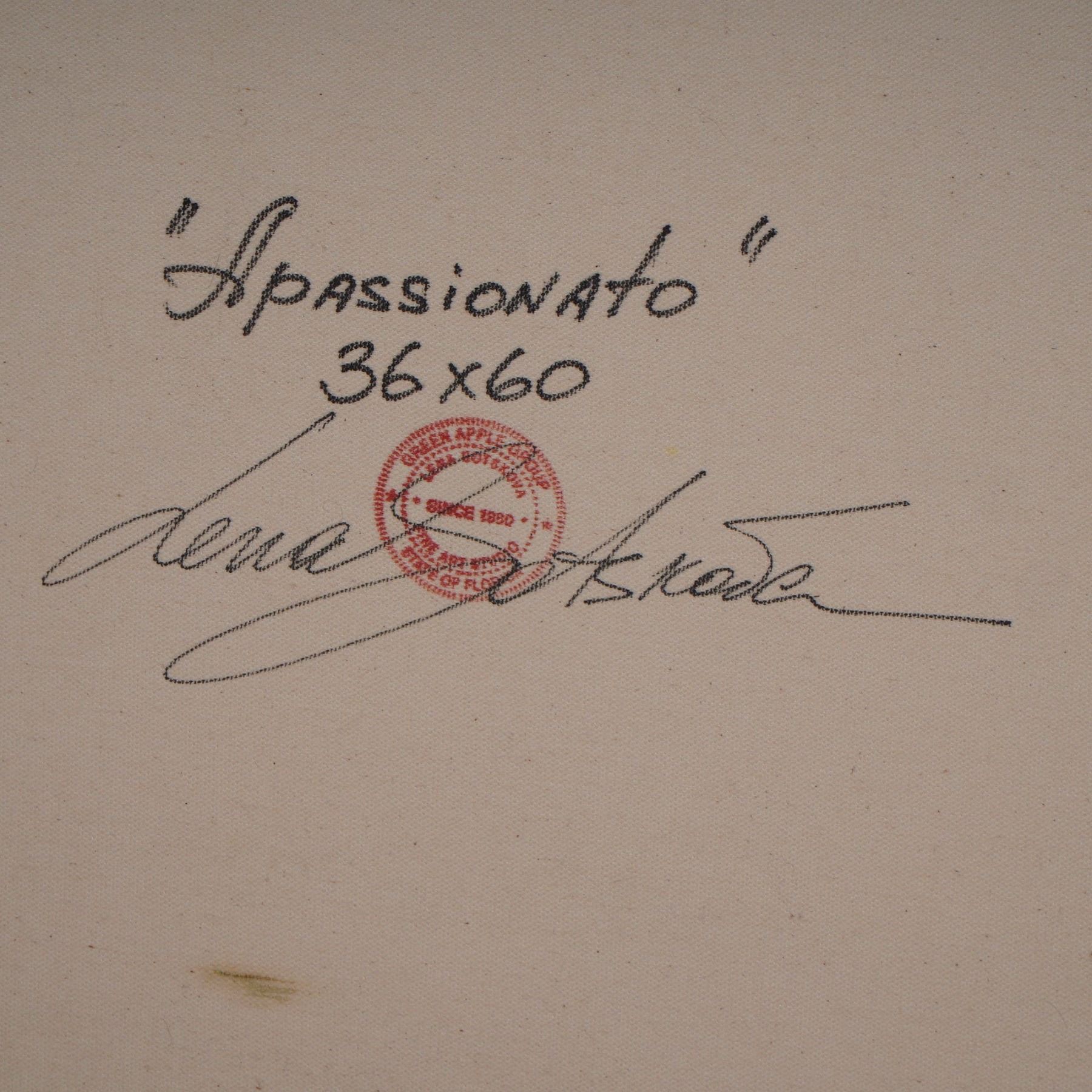 Vibrant and full of movement, this captivating giclee on canvas titled Apassionato by internationally acclaimed artist Lena Sotskova embodies her signature fusion of romance, music, and dramatic color. Published by Green Apple Group in July 2005, this limited edition artwork is number 245/375 and is hand embellished by the artist herself, adding rich texture and depth to the composition. The scene depicts a quartet of elegantly dressed musicians immersed in performance, rendered in warm, fluid tones that convey passion and harmony. Born in Russia, Sotskova has gained worldwide recognition for her evocative figurative works that often celebrate music, dance, and human connection. Each piece is individually signed and stamped with the publisher's round seal, ensuring authenticity, and is presented in a richly toned frame that enhances its bold palette. A standout statement piece for collectors of contemporary fine art. Signature on lower right. Certificate of Authenticity included.