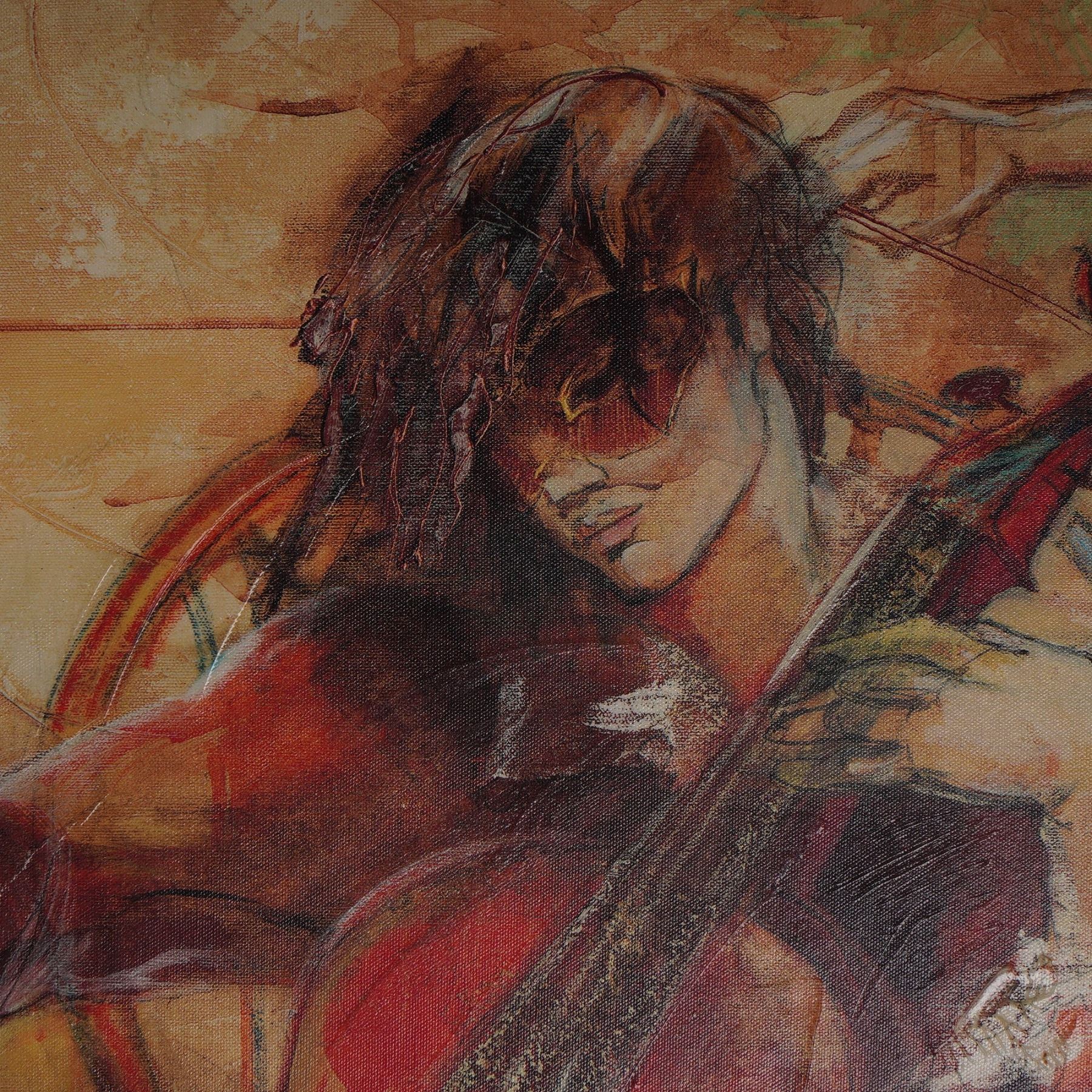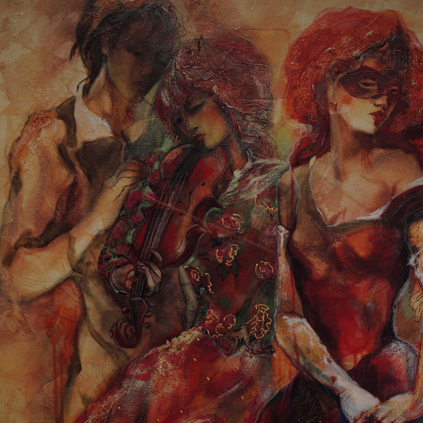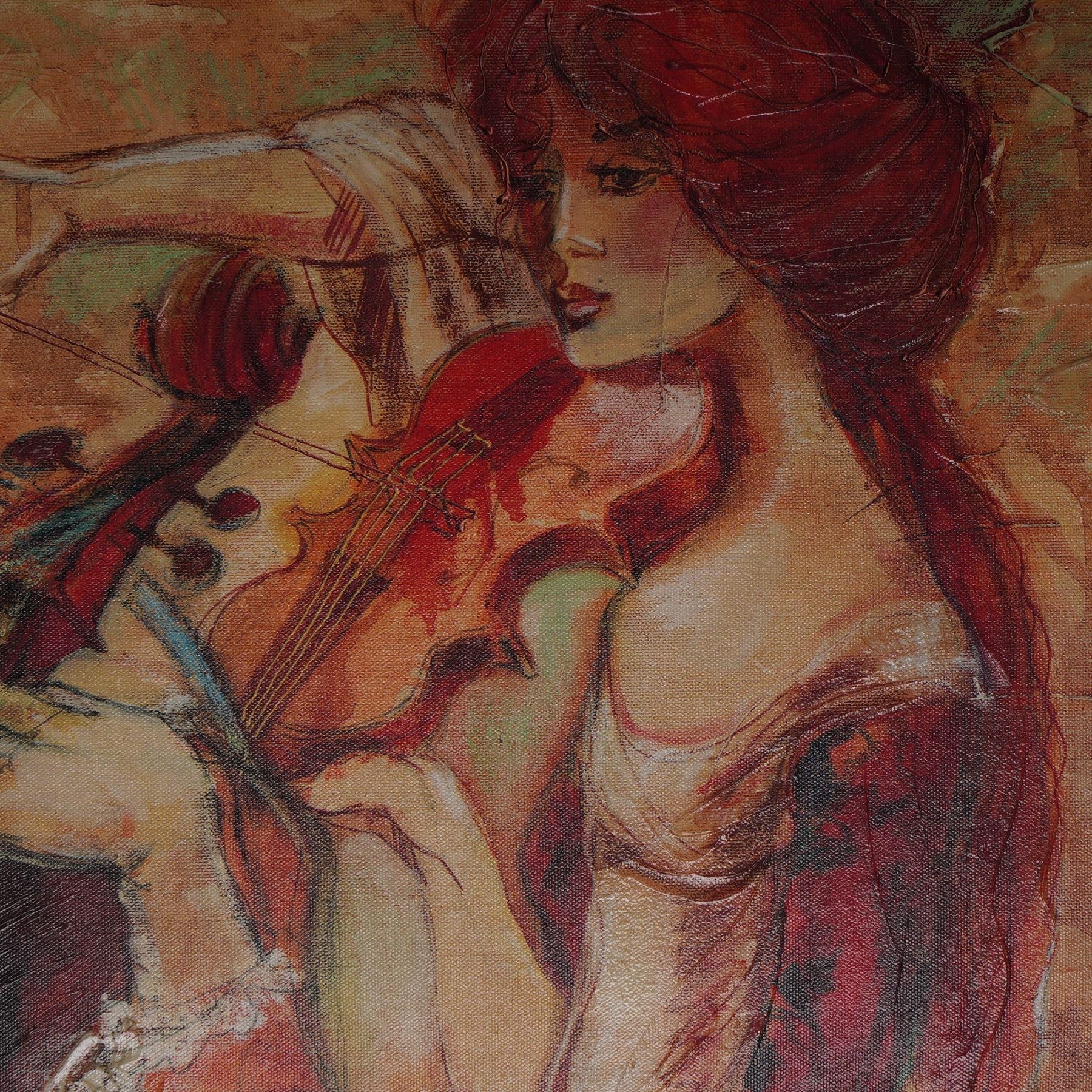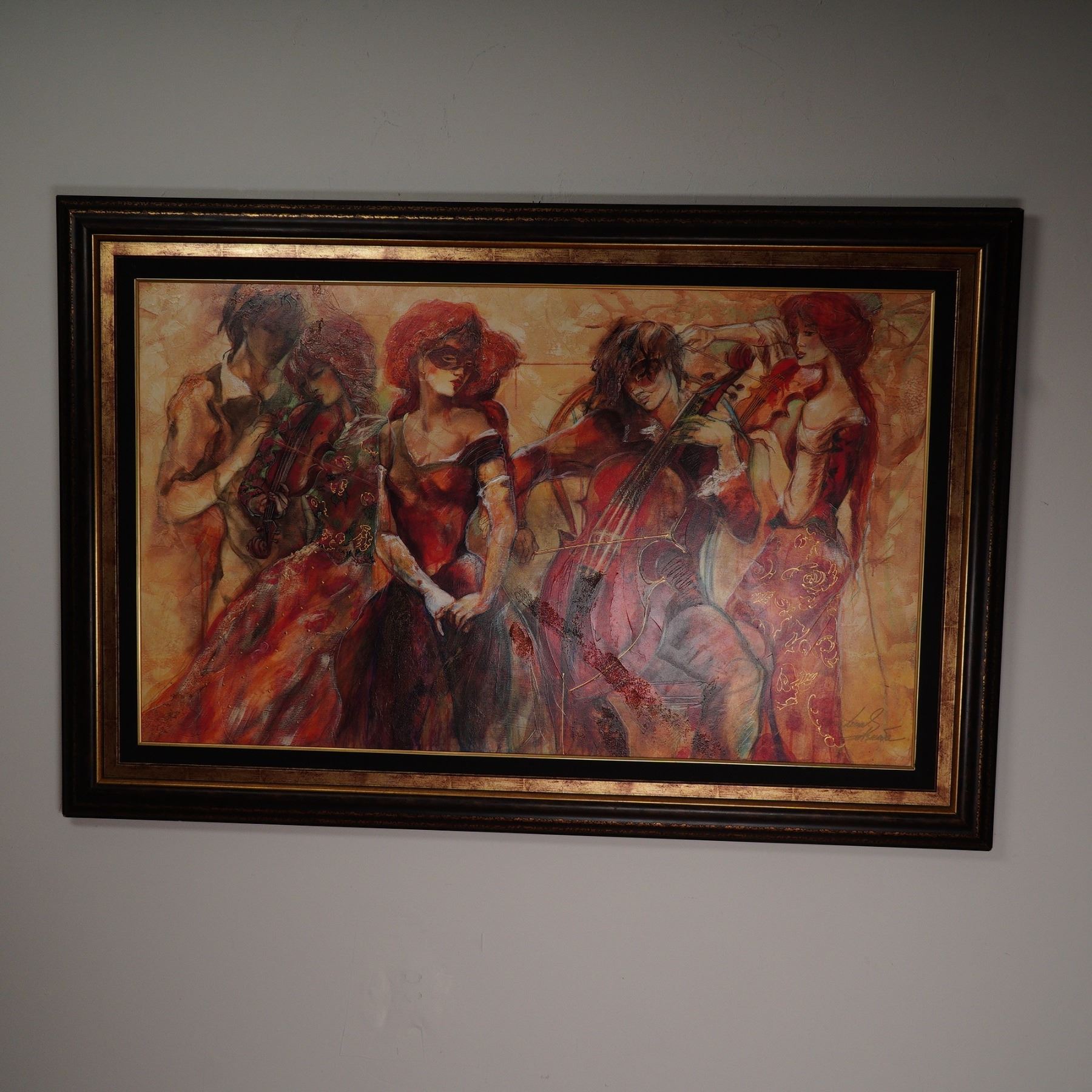 Vibrant and full of movement, this captivating giclee on canvas titled Apassionato by internationally acclaimed artist Lena Sotskova embodies her signature fusion of romance, music, and dramatic color. Published by Green Apple Group in July 2005, this limited edition artwork is number 245/375 and is hand embellished by the artist herself, adding rich texture and depth to the composition. The scene depicts a quartet of elegantly dressed musicians immersed in performance, rendered in warm, fluid tones that convey passion and harmony. Born in Russia, Sotskova has gained worldwide recognition for her evocative figurative works that often celebrate music, dance, and human connection. Each piece is individually signed and stamped with the publisher's round seal, ensuring authenticity, and is presented in a richly toned frame that enhances its bold palette. A standout statement piece for collectors of contemporary fine art. Signature on lower right. Certificate of Authenticity included.