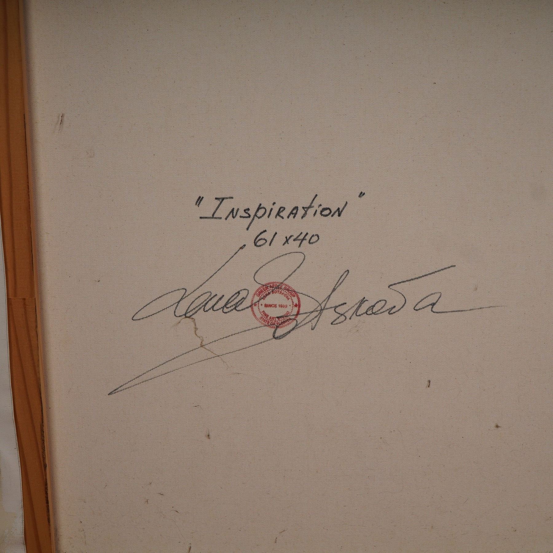 Monumental limited edition giclee on canvas titled Inspiration by acclaimed artist Lena Sotskova, published by Green Apple Group in November 2005. This vibrant and emotive work depicts a sensuous masked woman in a rich red bodice, lost in the music of her cello, painted in warm, textured tones with dramatic brushwork. Signed lower right by the artist and hand embellished, this piece is number 21/75 produced. Sotskova, born in Moscow and trained at the Moscow School of Art, is celebrated for her romantic, expressive style blending realism and impressionism, with a focus on figures, musical themes, and atmospheric compositions. Her works are collected internationally and exhibited in prestigious galleries. Presented in an elegant black and gold frame, this statement piece exudes both passion and sophistication. Signed lower right. Certificate of Authenticity included.