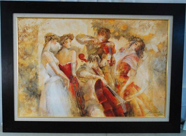 Hand Embellished Giclee on Canvas by World renowned Lena Sotskova, entitled "Muses". This beautiful work of art is hand singed and numbered by the artist in the lower margin. The giclee is also signed by the artist on verso and bears Sotskova's seal of authenticity. Edition 74/375. Overall approx 35" x 38". Scratches to the frame otherwise in excellent condition Condition: Scratches to the frame otherwise in excellent condition