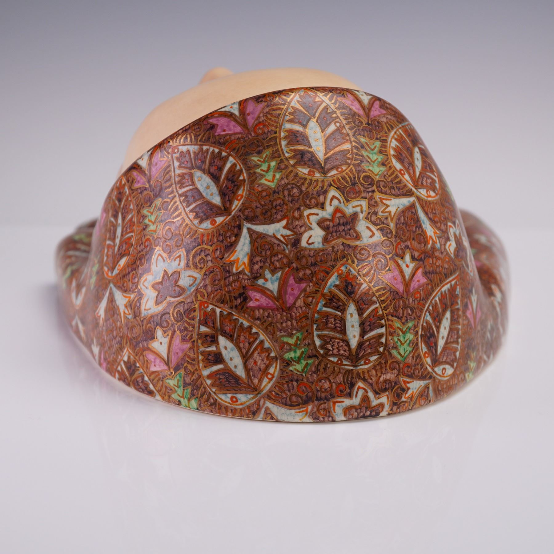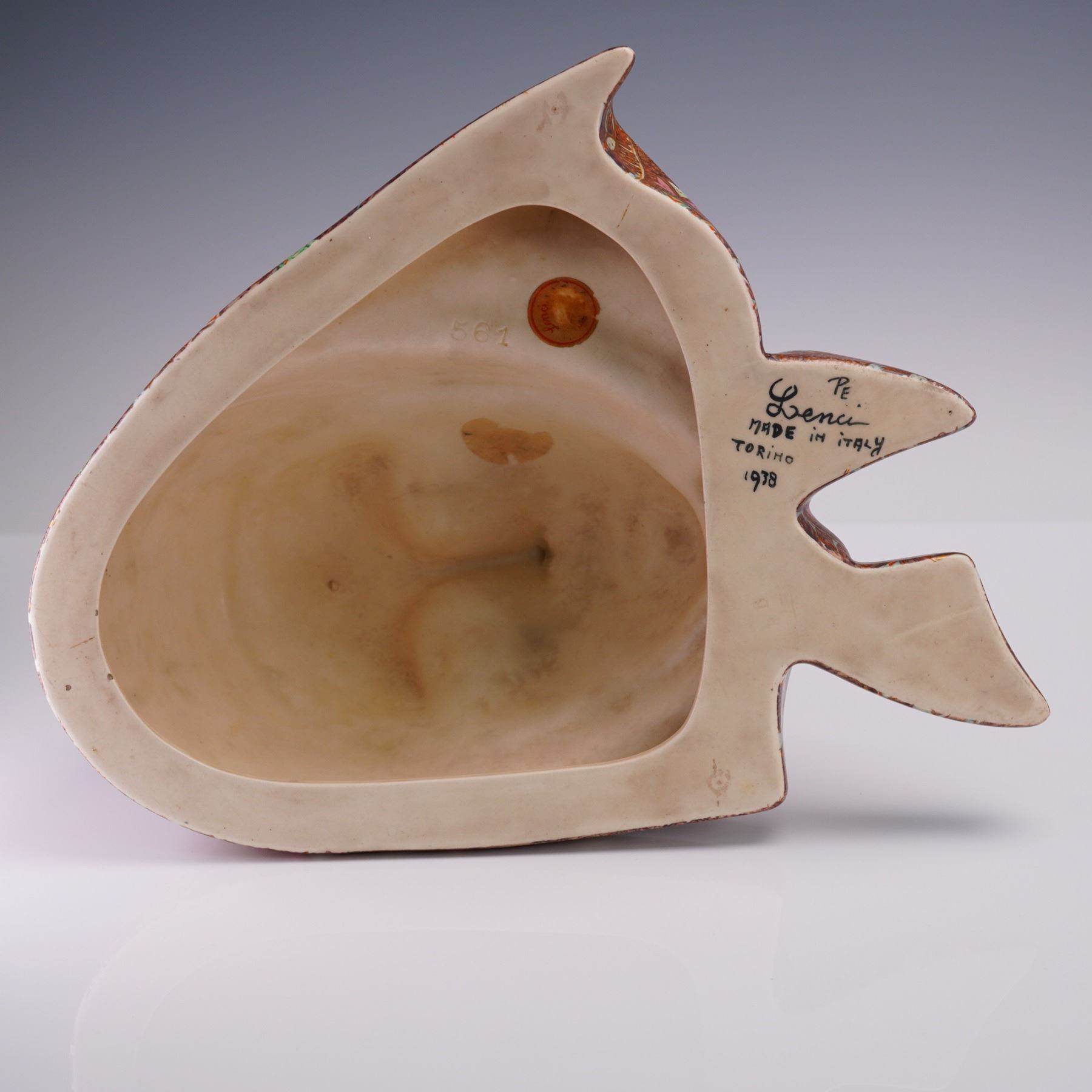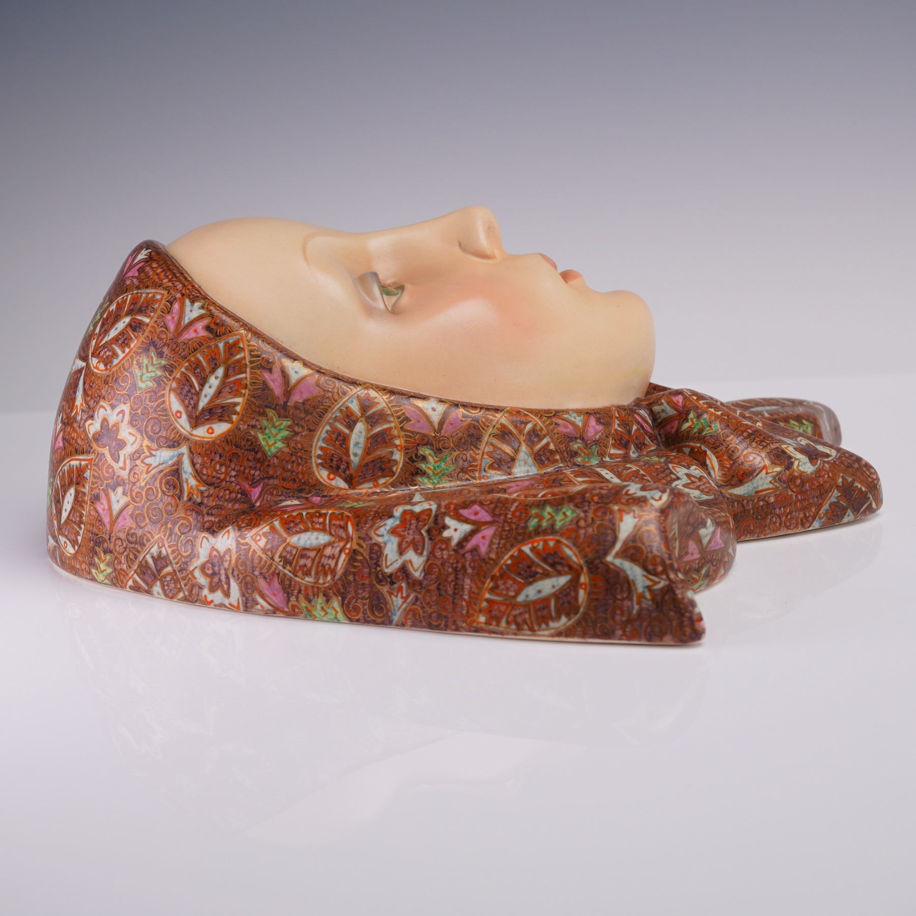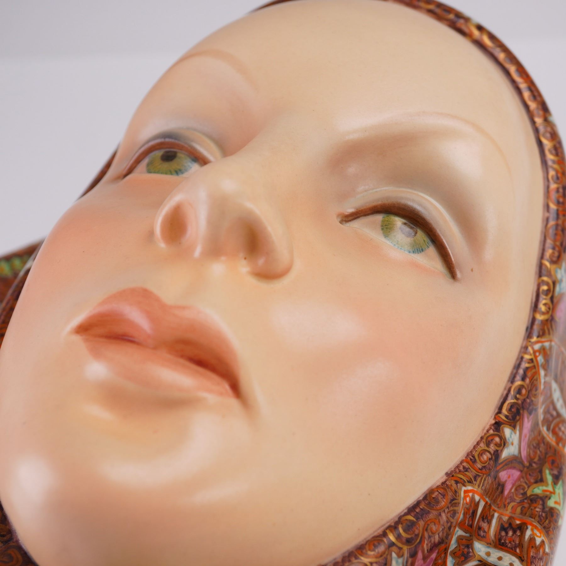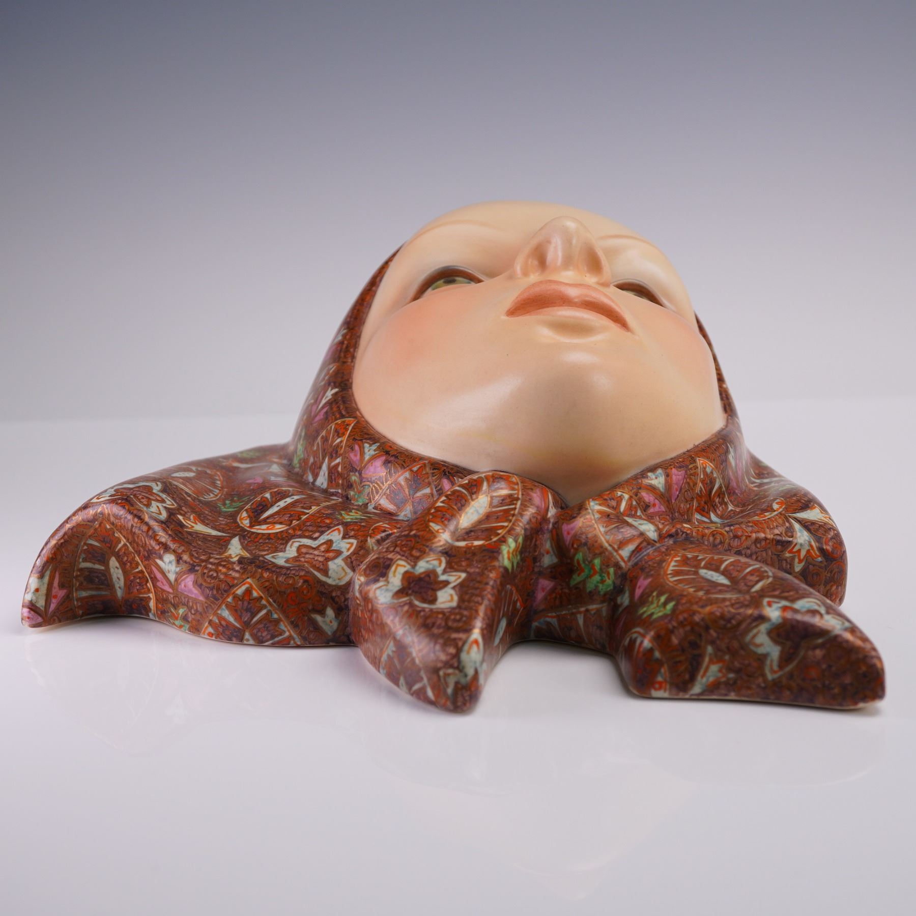 Art Deco ceramic wall mask designed by Helen Konig Scavini for Lenci. The sculpted face of a woman is rendered in a serene expression with delicately painted features and downcast green eyes. The mask is adorned with a highly detailed headscarf, hand-decorated in an intricate pattern of floral and leaf motifs in red, brown, pink, green, and white enamel, accented with gilt highlights. The underside bears the incised model number 561 and a partial Lenci Torino label. It is also inscribed "PE Lenci, Made in Italy, Torino, 1978," indicating its place and date of manufacture.