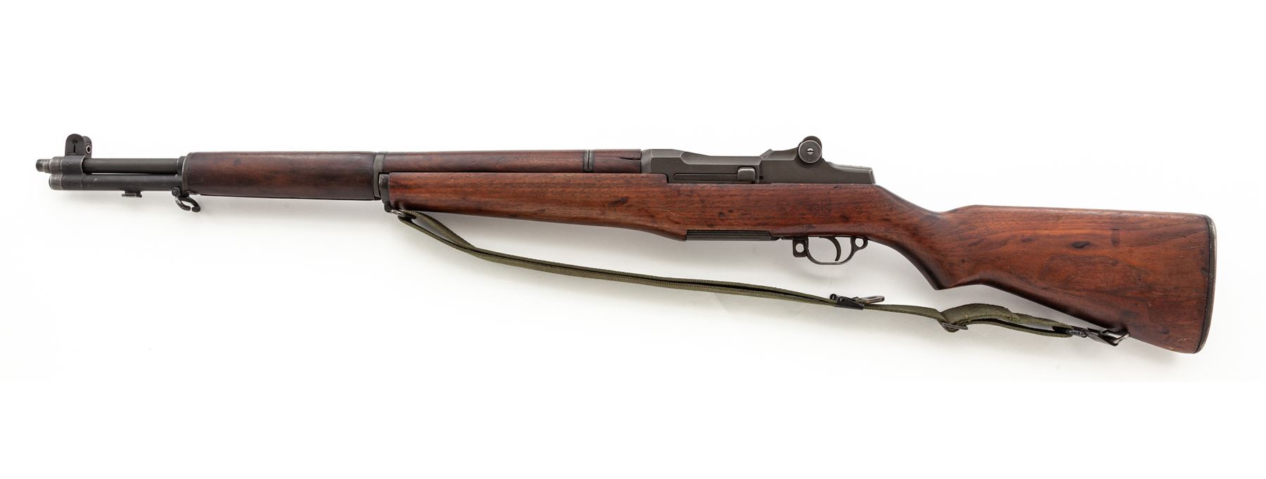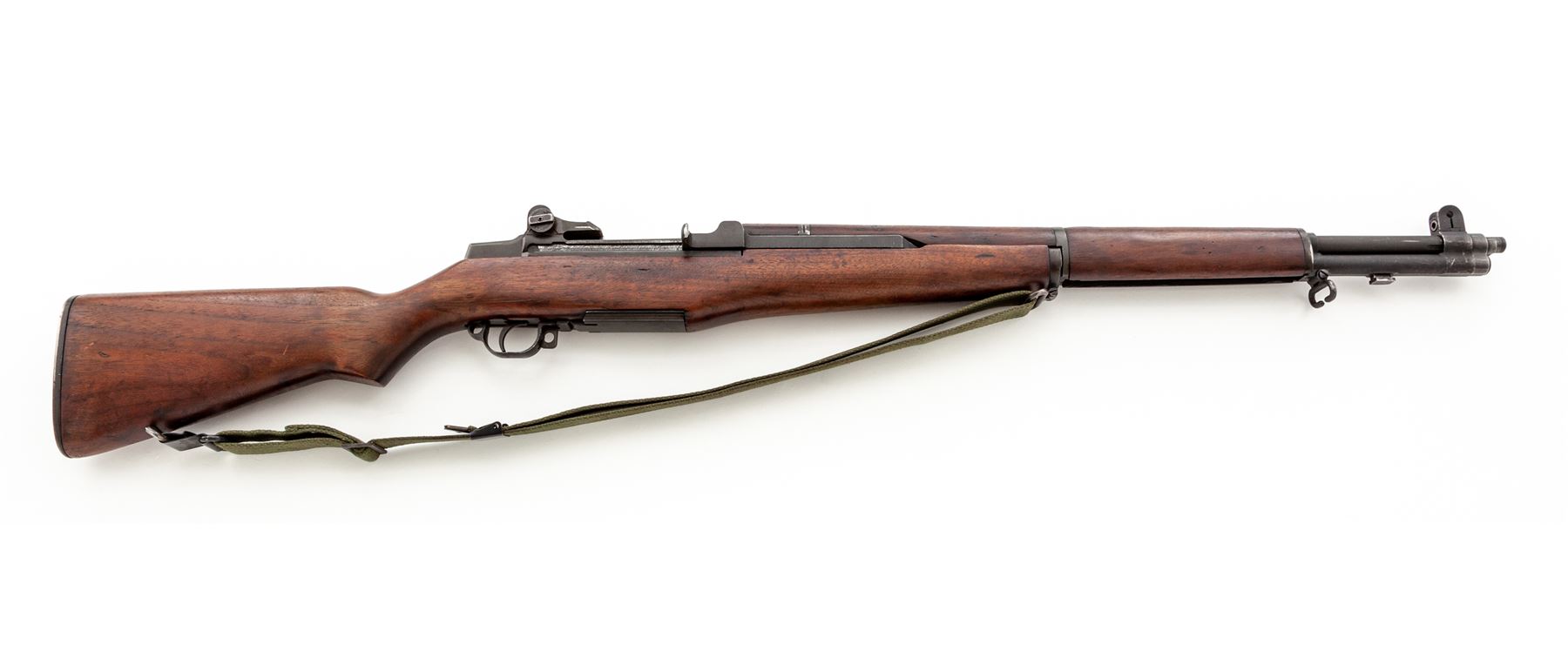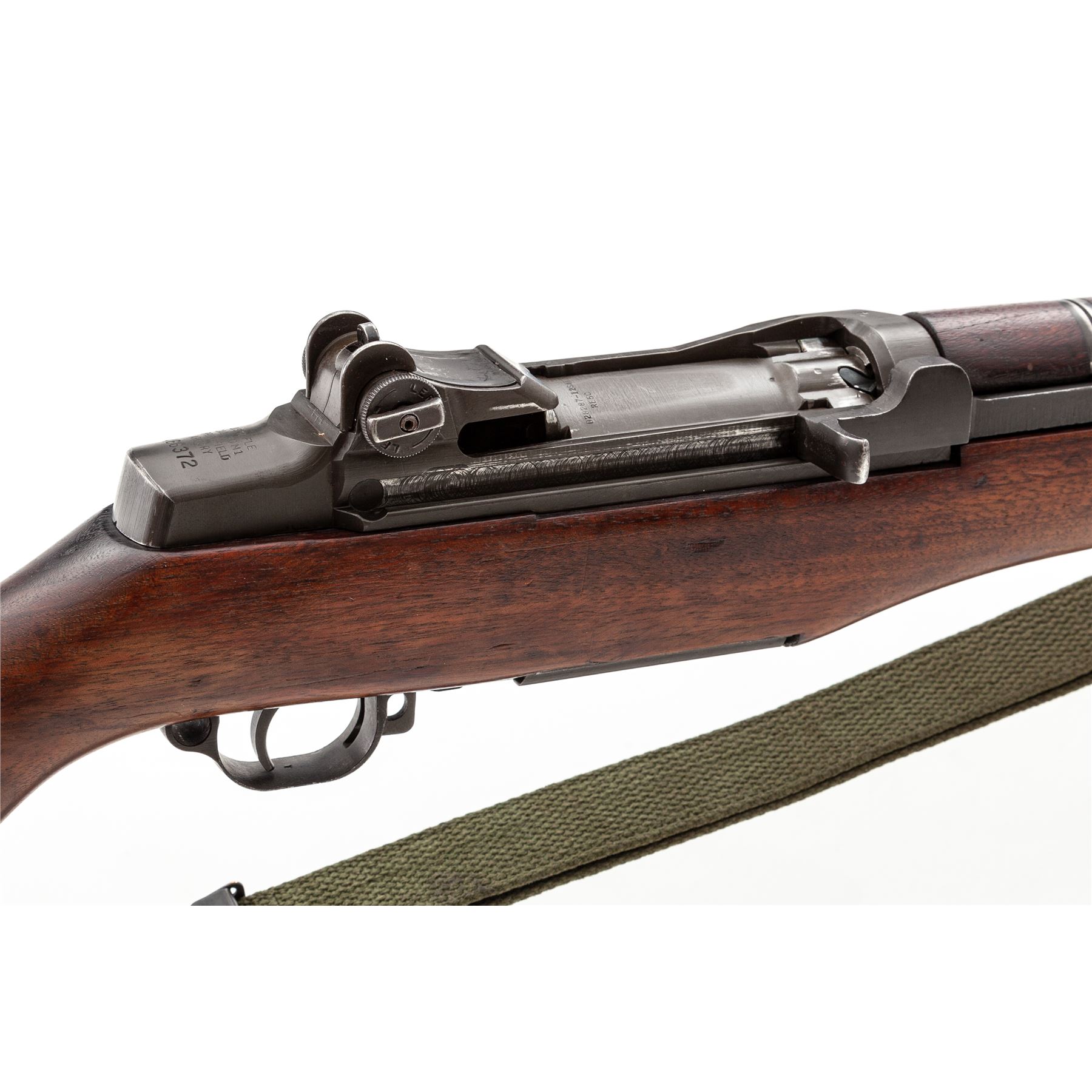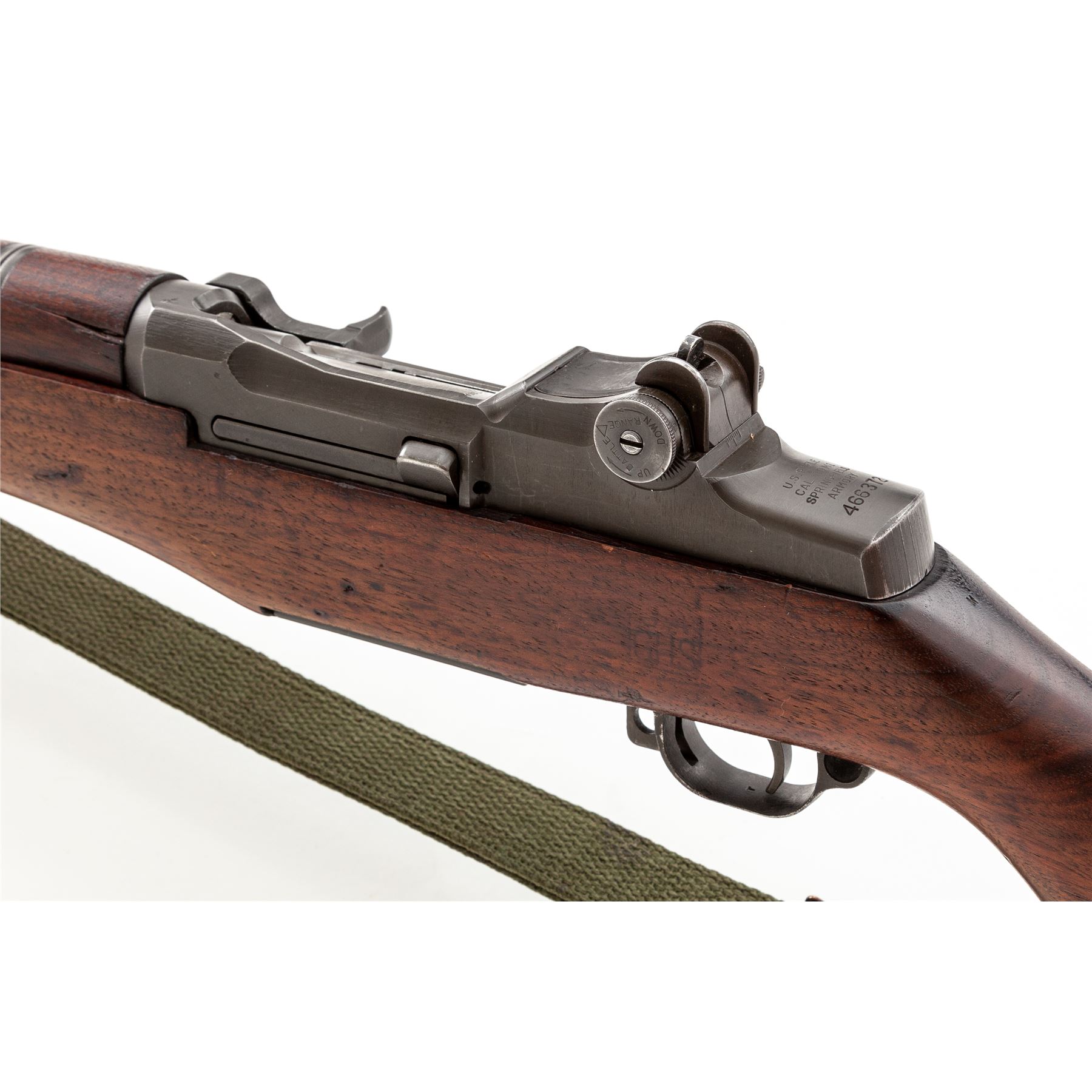 Lend Lease Springfield M1 Garand Semi-Automatic Rifle, #466372, .30-06 cal., 24'' barrel, parkerized finish, walnut stock, blade front sight with protecting ears and adjustable lock bar aperture rear sight. Top of barrel is stamped with British Birmingham export proof stamps. Marked on receiver tang ''U.S.RIFLE CAL. .30 M1 SPRINGFIELD ARMORY''. Bolt, trigger housing, operating rod, and hammer marked ''SA''. Barrel stamped ''S-A-1-1-42''. Stock has ''circle ''P'' firing proof on underside of wrist and faint ''SA GHS'' cartouche on left side of stock. Early style solid gas plug. Condition overall is very good with over 90% of the refinish remaining on the metal. Wood has several repaired knot areas and a crack/chip in the rear handguard, otherwise very good. Action is smooth, bore is very good with very good rifling. Includes a U.S.M-10 cleaning kit in the butt trap and a U.S.G.I. green cotton sling in very good condition. Est.: $900-$1,200. (C&R)