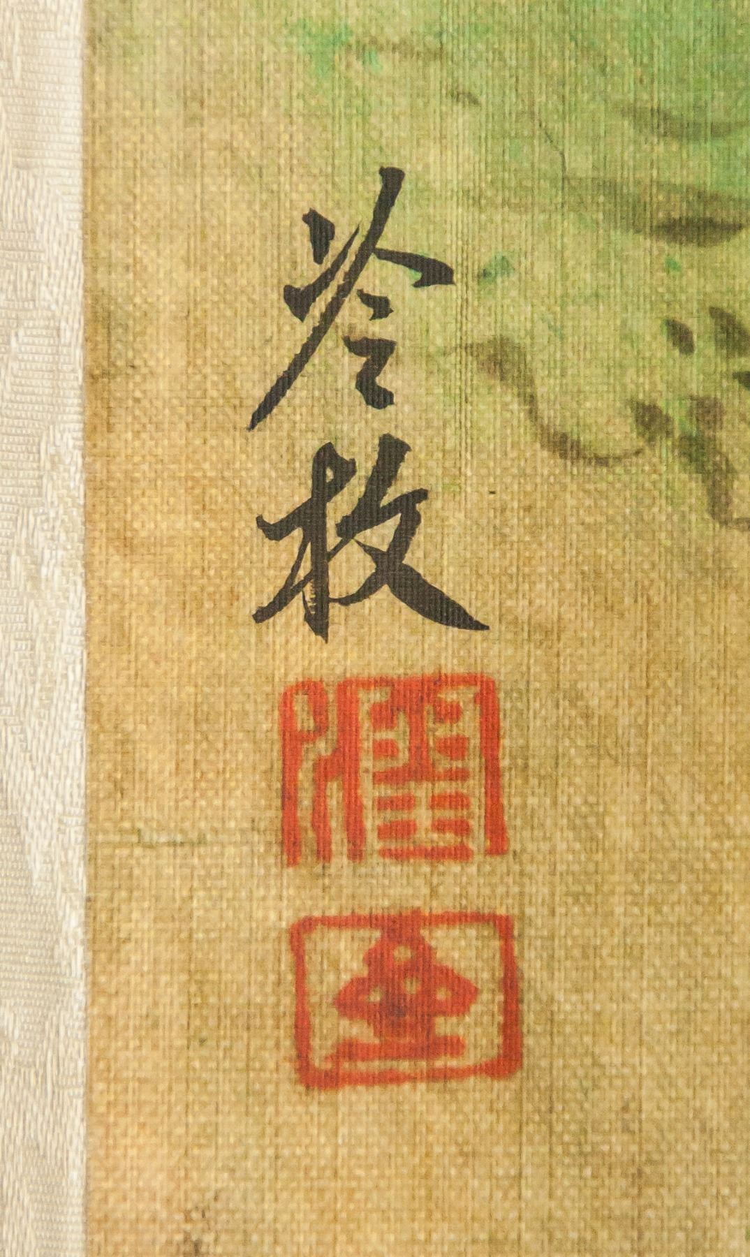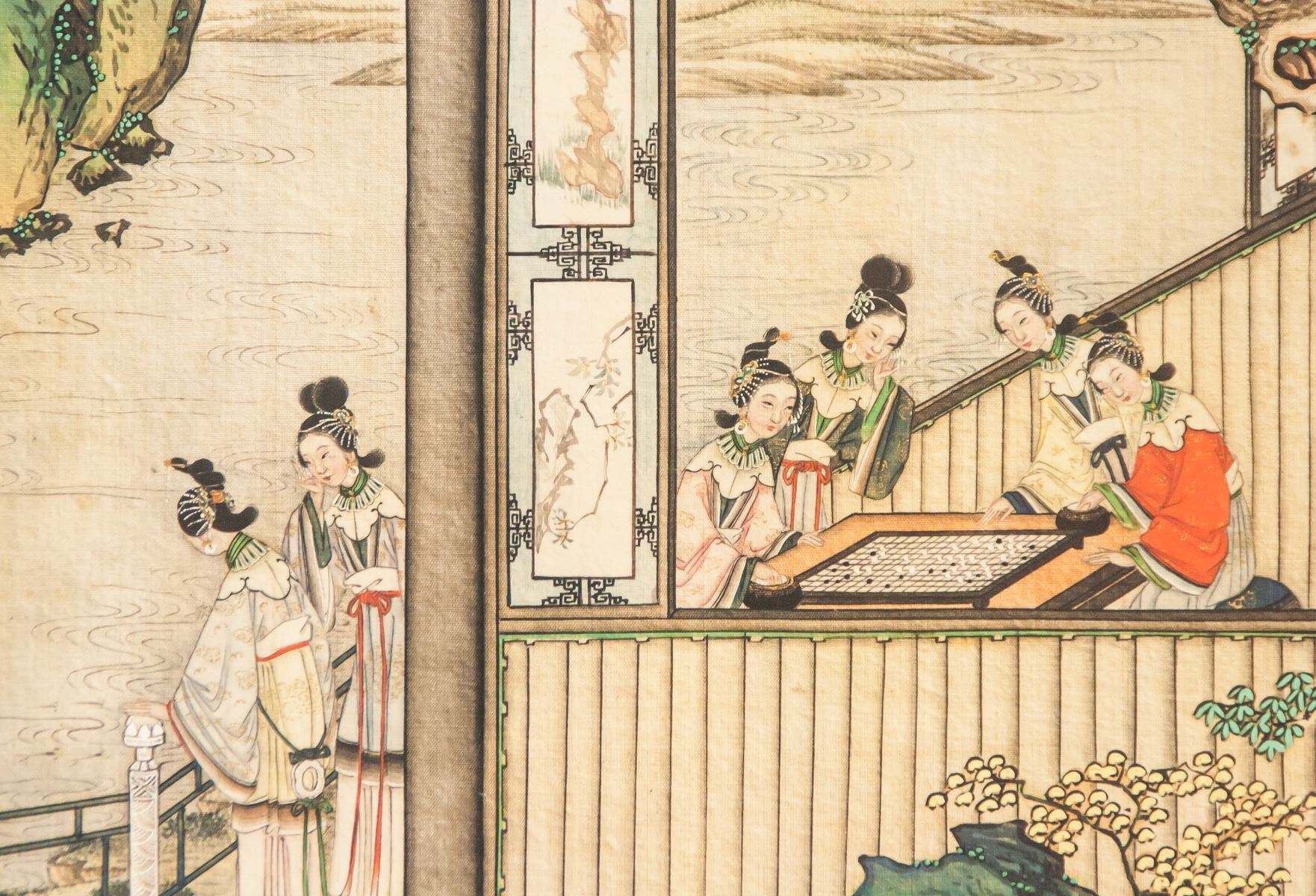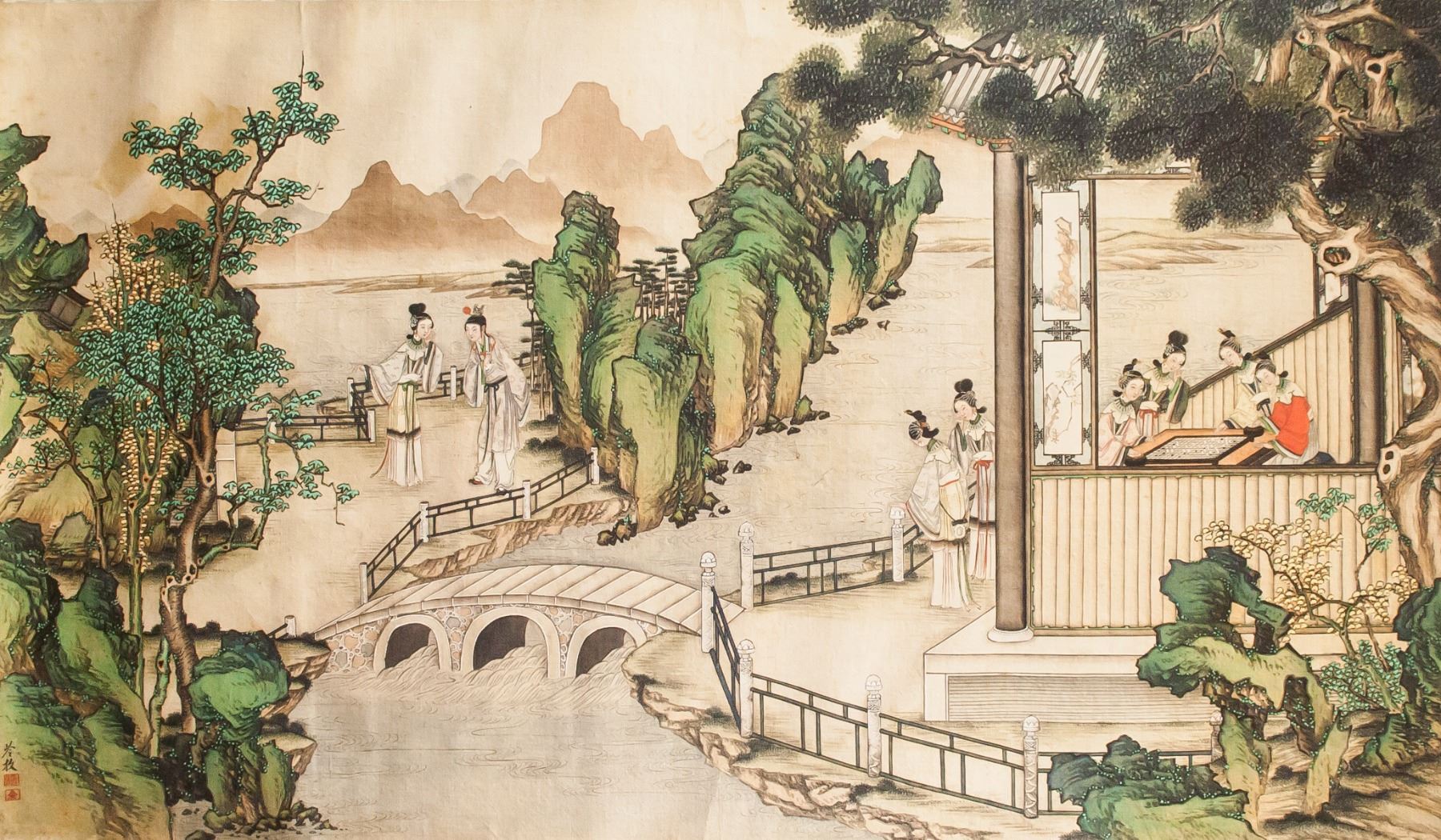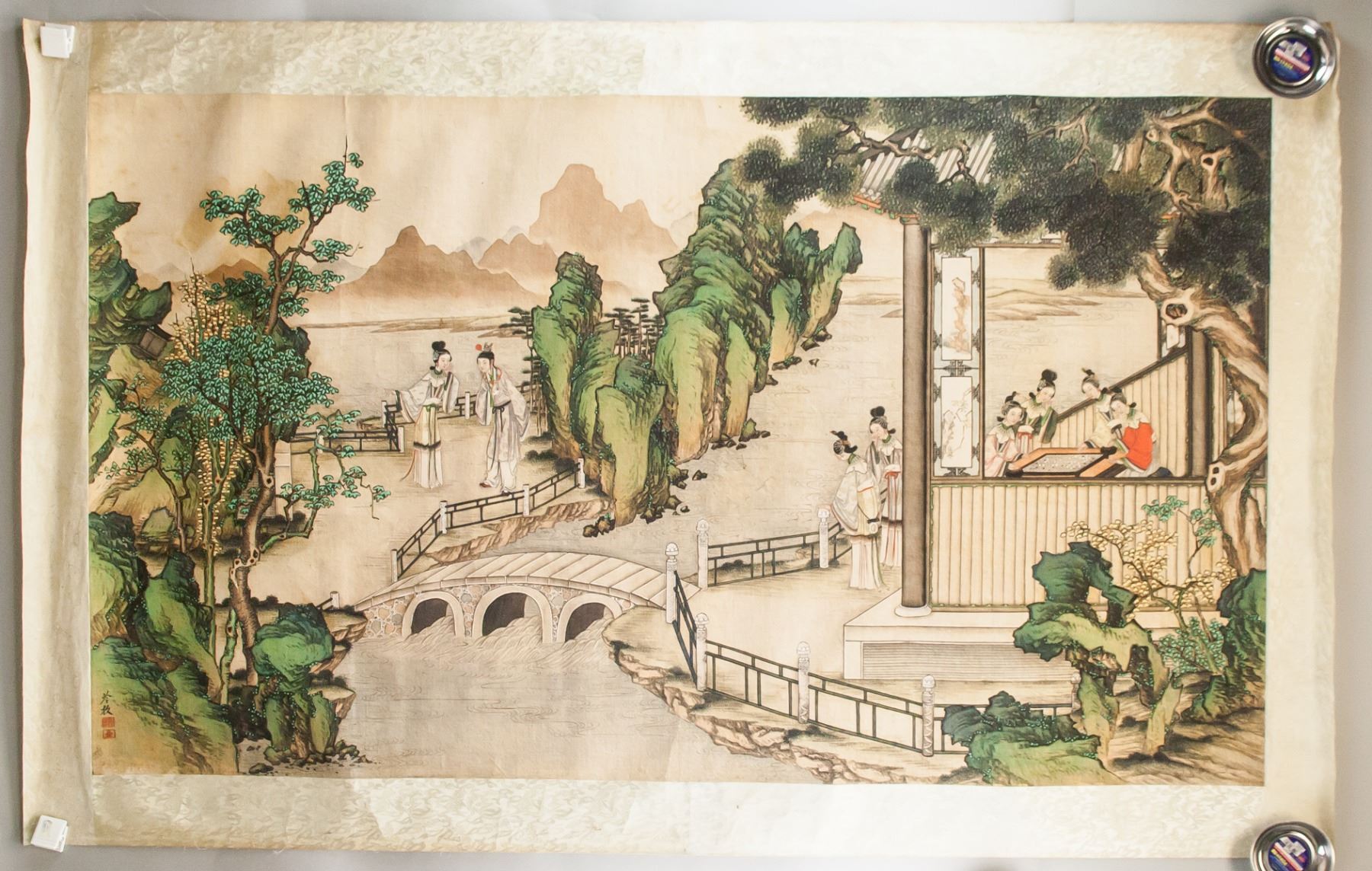 Print on cloth roll. Featuring beauties and landscape. Originally painted by Leng Mei (1669-1742, Chinese). 89 x 153 cm