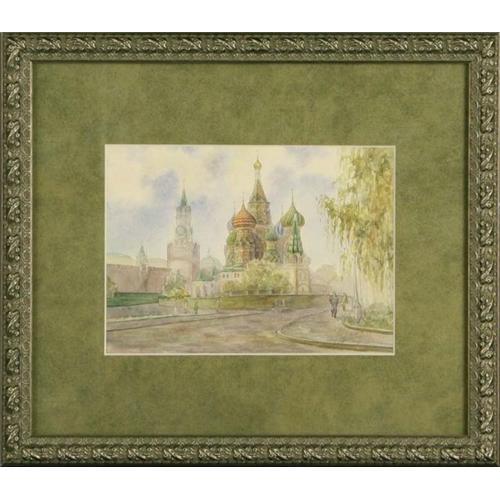 This lovely painting of Moscow is painted with muted colors and a very controlled, light style. Excellently matted and framed in ornate gold wood, this 14? high by 15? wide watercolor painting