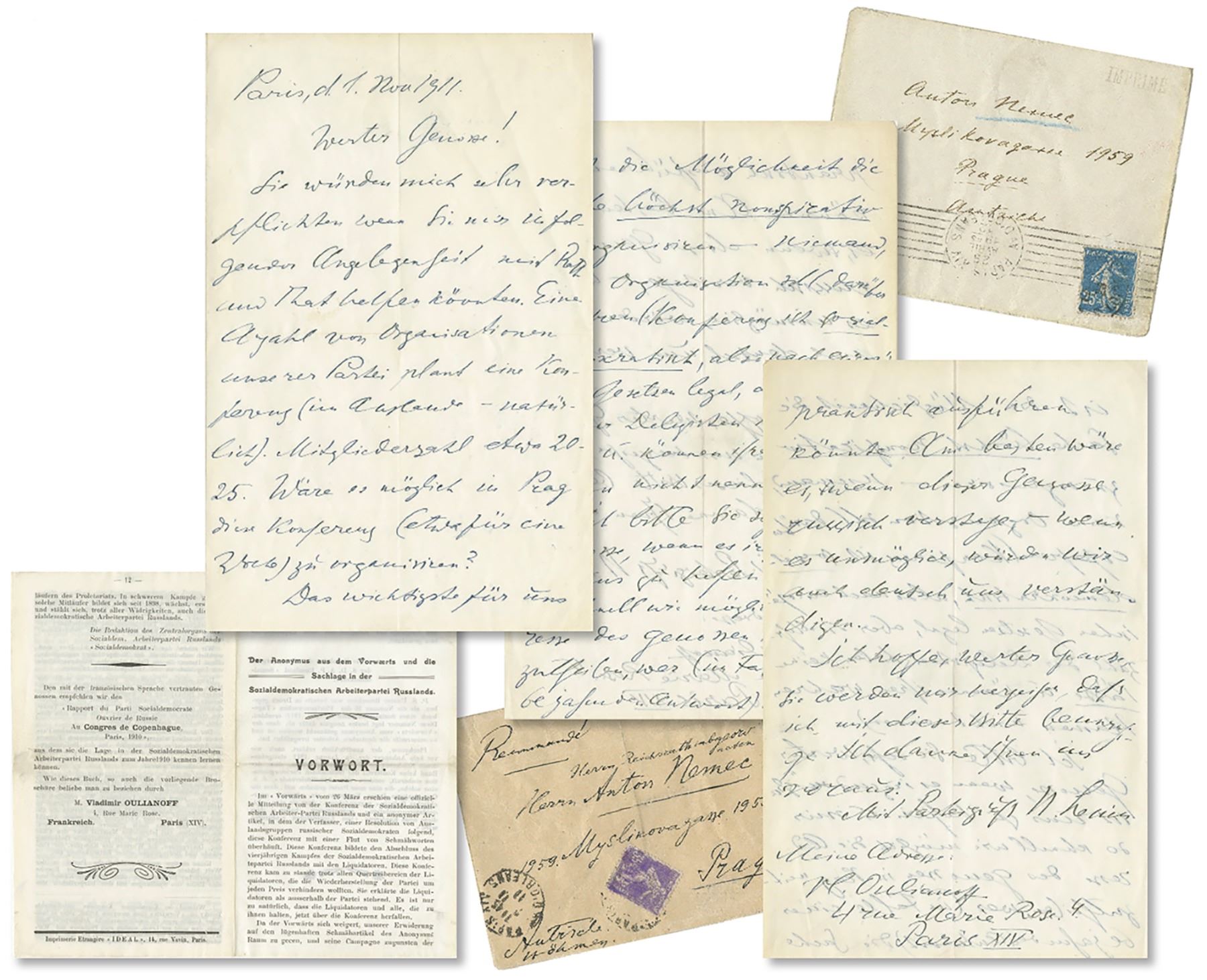 143. * Lenin, Vladimir Ilyich. Rare and important autograph letter signed ("N. Lenin"), 3-pages (5.4 x 8.25 in.; 137 x 210 mm) on conjoined leaves, in German, Paris, 1 November 1911, written to the Czech Social-Democratic leader Anton Nemec in Prague, with original transmittal envelope addressed in Lenin's hand. The letter concerns organizing the famous All-Russia Conference of the Russian Social-Democratic Labor Party in Prague. Lenin adopted the pseudonym "N. Lenin" in 1901 when he was involved in revolutionary activities in Germany. Includes envelope addressed to Nemec by Lenin's wife, revolutionary Nadezhda Krupskaya, postmarked Paris, 29 April [19]12, with enclosed 4.25 x 7.5 in. (108 x 190 mm) printed pamphlet in German "Der Anonymus aus dem Vorwaerts und die Sachlage in der Sozialdemokratischen Arbeiterpartei Russlands" discussing the results of the Prague Conference. Usual folds.