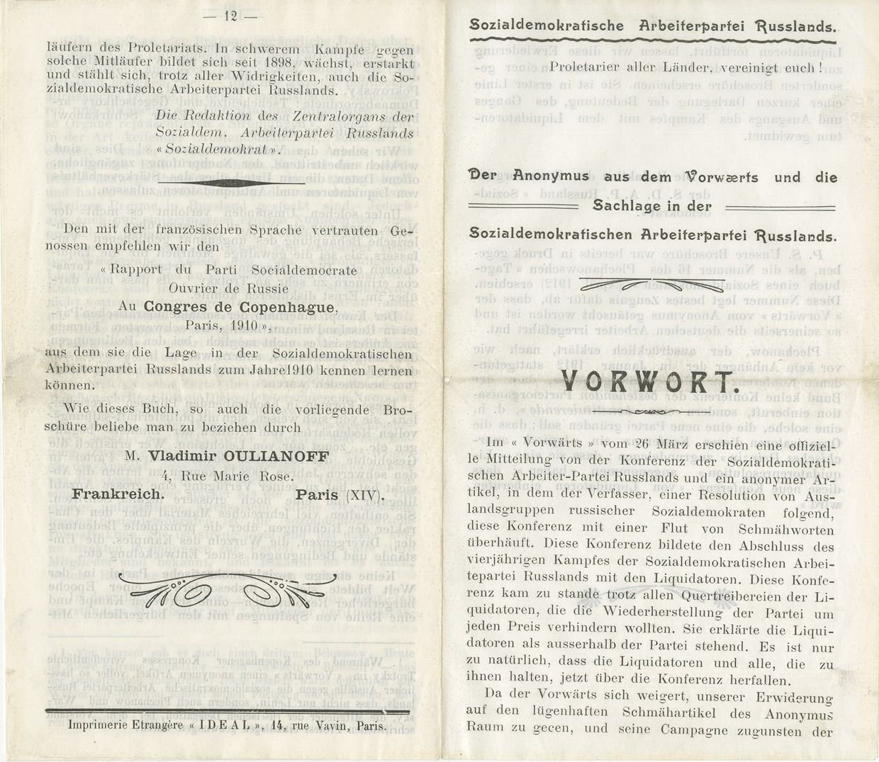 Lenin writes in full (translated from German): Dear Comrade, I should be much obliged if you would assist me with your advice and help in the following matter: several sections of our Party intend to convene a Conference (abroad of course). The number of Conference members will be from twenty to twenty-five. Would it be possible to organize the Conference in Prague? (It would last about a week.) It is very important for us to organize the affair in extreme secrecy. No one, not a single organization, must get to hear of it (the Conference is to be Social-Democratic and consequently legal, according to European laws, but most of the delegates do not possess passports and cannot give their real names). I would ask you, dear comrade, if you think it is possible, to help us and to let us know as soon as you can the address of a comrade in Paris, who (in the event of an answer in the affirmative) could arrange this matter practically. It would be best if the comrade understood Russian, but if that is impossible, we could make ourselves understood in German.
