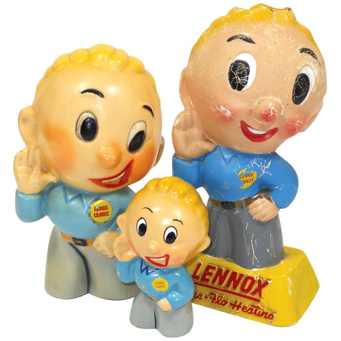 Lennox Furnaces adv figures (3), ceramic salt shaker & two larger composition Lennys, figure on stan