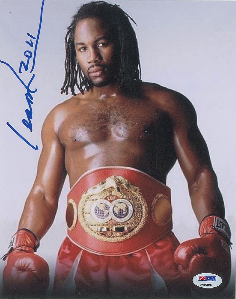 Color satin-finish 8 x 10 photo of Lewis wearing his championship belt, signed vertically in blue felt tip. In fine condition, with image a bit grainy and a PSA/DNA authentication label affixed to lower corner. Accompanied by a certificate of authenticity from PSA/DNA.