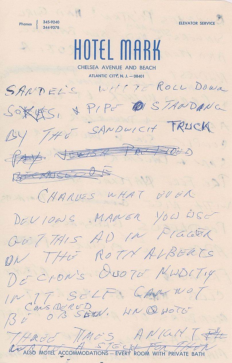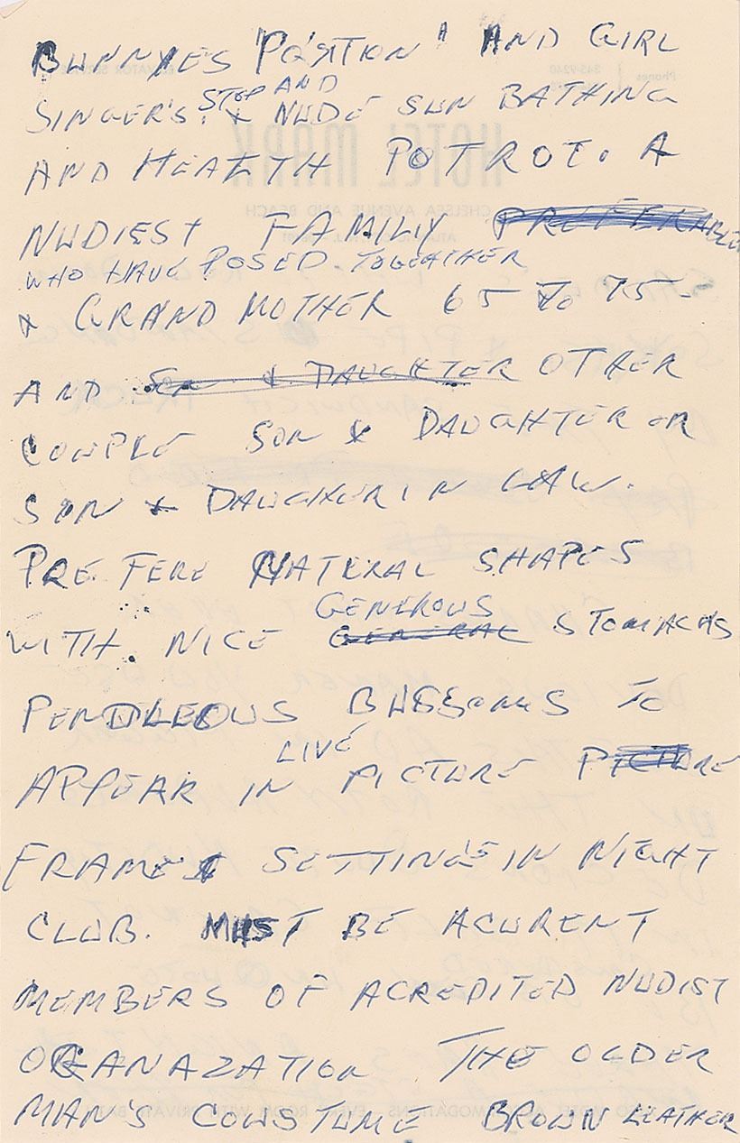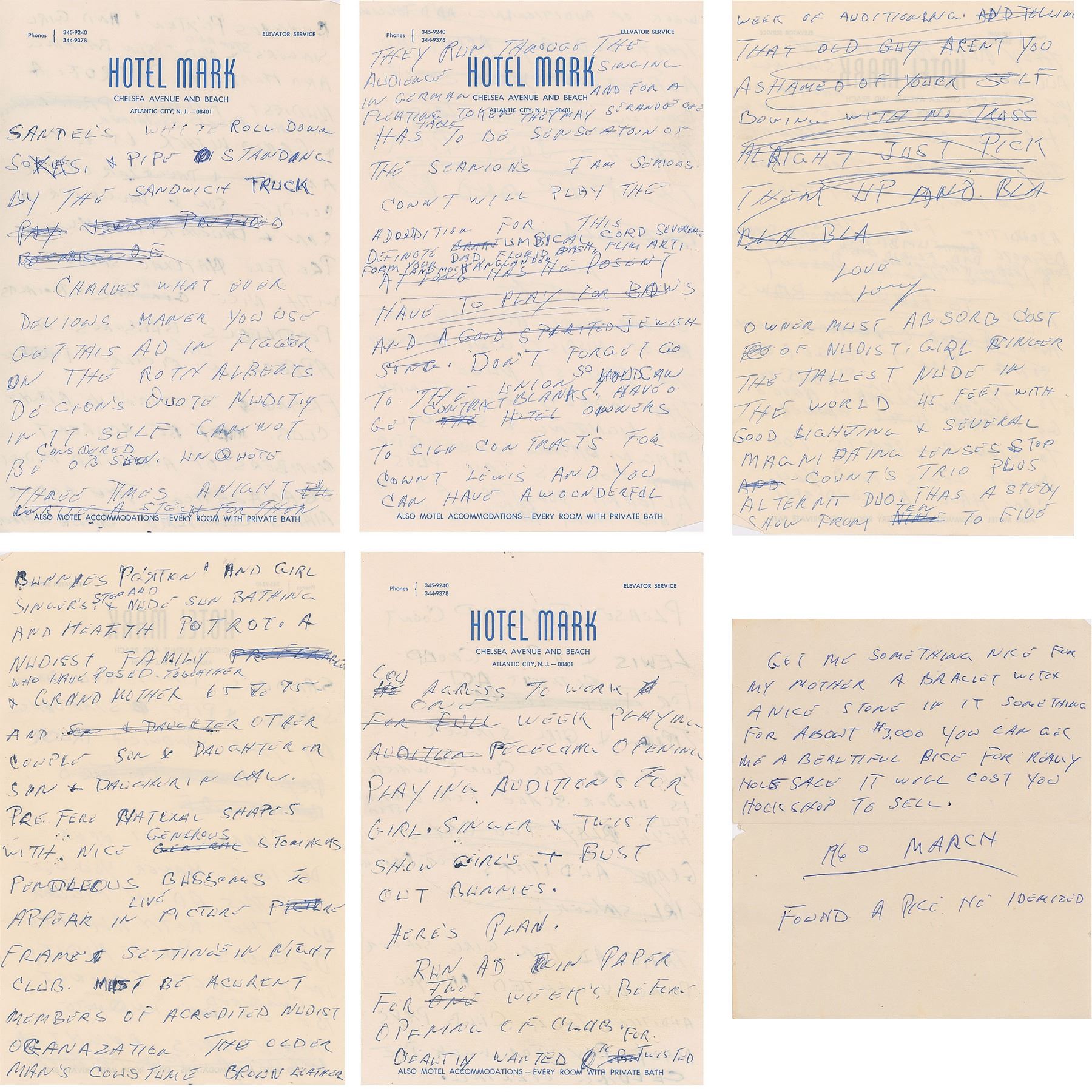 A six-page manuscript of notes on Hotel Mark stationery, signed “Love, Lenny,” in part: “Here’s plan. Run ad in paper for two week’s before opening of club. Beauty wanted for twisted Bunnies ‘position’ and girl singer’s stop and & nude sun hating and health potrot. A nudiest familiy who have posed togeather & grandmother 65 to 75 and other couple son & daughter or son & daughter in law. Prefere naturel shapes with nice generous stomacks pendleous bussoms to appear in live picture frame setting’s in night club. Must be a curent members of acredited nudist oganazation…Charles what ever devious matter you use get this ad in figged on the Roth Alberts decion’s quote nudity in it self cannot be considered obseen. Unquote.”