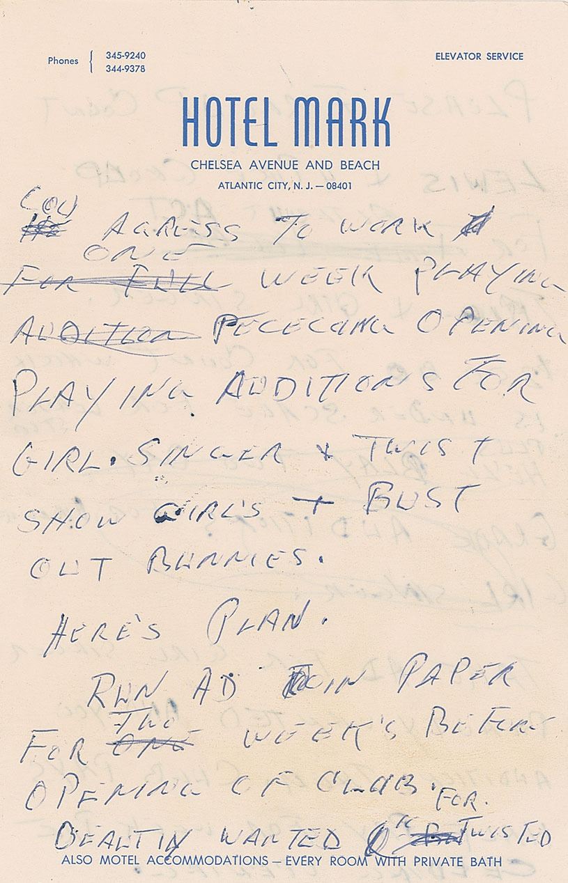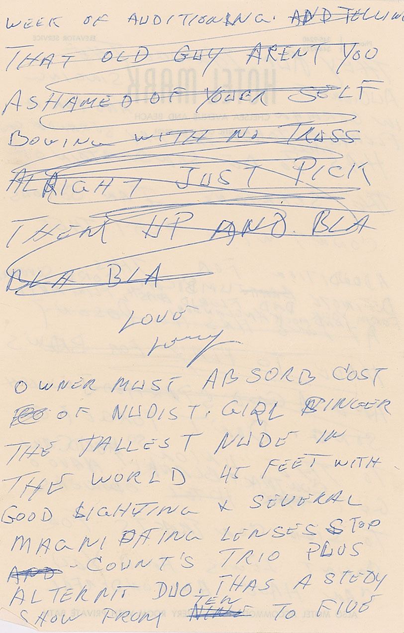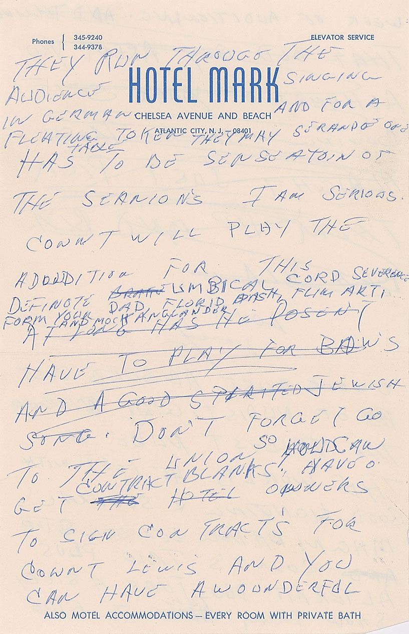 A six-page manuscript of notes on Hotel Mark stationery, signed “Love, Lenny,” in part: “Here’s plan. Run ad in paper for two week’s before opening of club. Beauty wanted for twisted Bunnies ‘position’ and girl singer’s stop and & nude sun hating and health potrot. A nudiest familiy who have posed togeather & grandmother 65 to 75 and other couple son & daughter or son & daughter in law. Prefere naturel shapes with nice generous stomacks pendleous bussoms to appear in live picture frame setting’s in night club. Must be a curent members of acredited nudist oganazation…Charles what ever devious matter you use get this ad in figged on the Roth Alberts decion’s quote nudity in it self cannot be considered obseen. Unquote.”