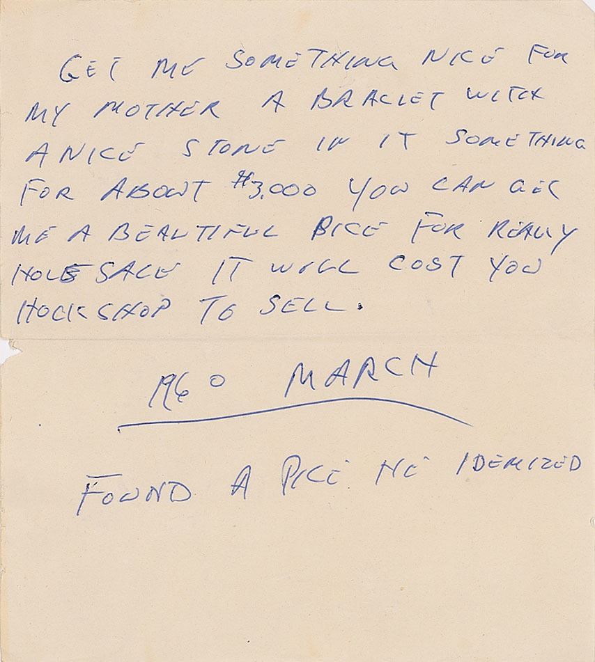 A one-page note, unsigned, in full: “Get me something nice for my mother a bracelet with a nice stone in it something for about $3,000 you can get me a beautiful pice for really holesale it will cost you hockshop to sell, 1960 March, found a pice he idemized.”