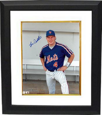 The Mets signed Lenny Dykstra as a 13th round draft pick in 1981. In 1985 Dykstra, deemed ready for the major leagues, was promoted to the Mets when the team's starting center fielder, Mookie Wilson, was placed on the disabled list. The rookie's play and energy were a big boost to a Mets team that surged to a 98-win season and narrowly missed out on the NL East crown. The following season, Dykstra was first intended to be platooned in center field with Wilson, but when Mookie suffered a severe eye injury during spring training Dykstra took over the position as outright starter and leadoff hitter. Mets fans soon nicknamed Dykstra "Nails" for his hard-nosed personality and fearless play. In 1986, he even posed shirtless for a "beefcake" poster under the "Nails" nickname. Dykstra and #2 hitter Wally Backman were termed "the Wild Boys" for their scrappy play as spark plugs for the star-studded Met lineup.Lenny Dykstra has hand signed this New York Mets 8x10 Photo. Certificate of Authenticity from Athlon Sports Collectibles. Custom White Mat and Premium Black Frame as shown.
