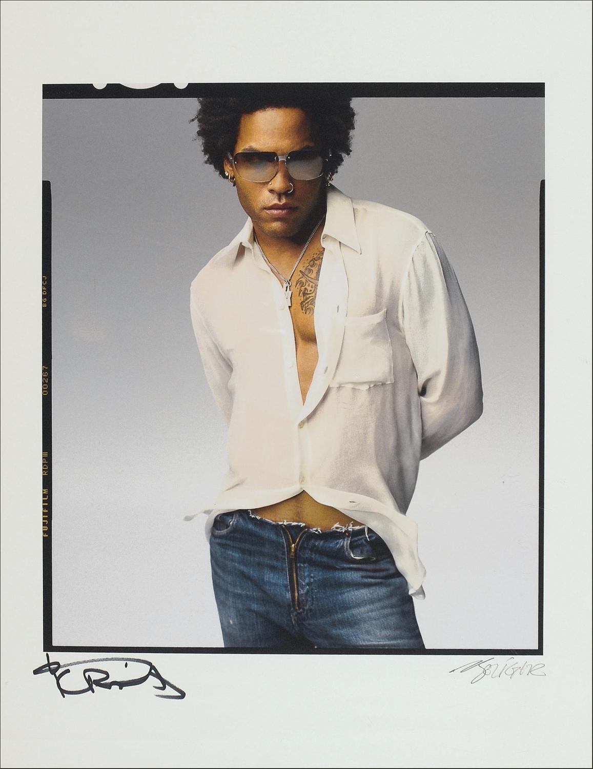 Color 14.5 x 18.75 poster of the singer in torn jeans and a mostly unbuttoned shirt, signed in black felt tip. Also signed in pencil by the artist Mark Seligman, a Rolling Stone magazine photographer. Rolled and in fine condition, with a few edge dings.