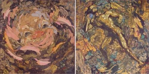 Lenore Beran (b. 1925) American (two) ALL THE GAMES, collage on paper, 24 x 24", signed lower right, framed, natural cracking in resin throughout with 1" break center left; FANTASTIK CLOWN, collage on paper, 24 x 24", signed lower right, framed, natural cracking in resin throughout, chip lower left. Provenance: Shirley Meyer Gallery (2)