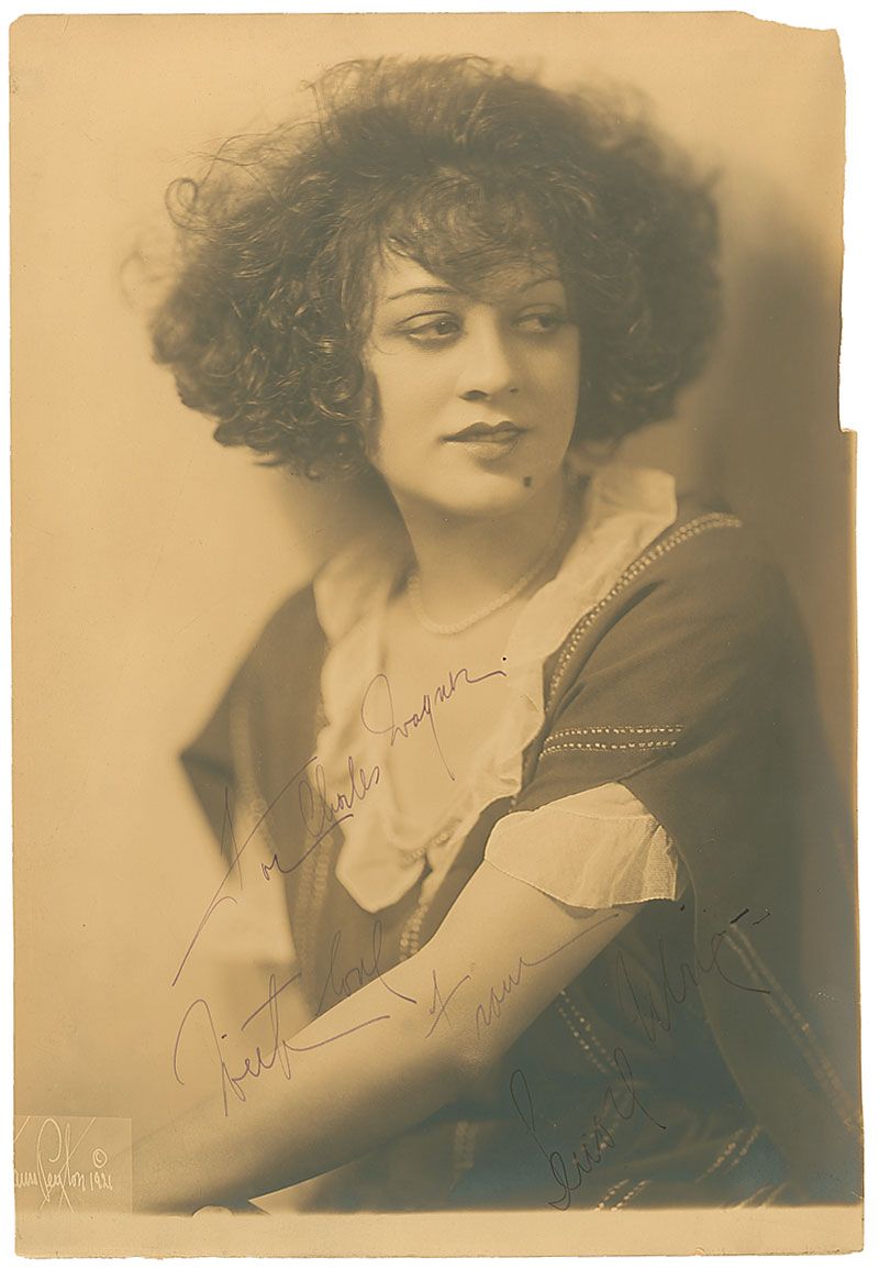 Vintage matte-finish 9.5 x 14 photo of Ulric sporting a curly hairdo, signed and inscribed in fountain pen, “For Charles Wagner, With love, from Lenore Ulric.” In very good condition, with chipping to trimmed edges, a few small edge tears, and moderate contrast to signature against her dark outfit.