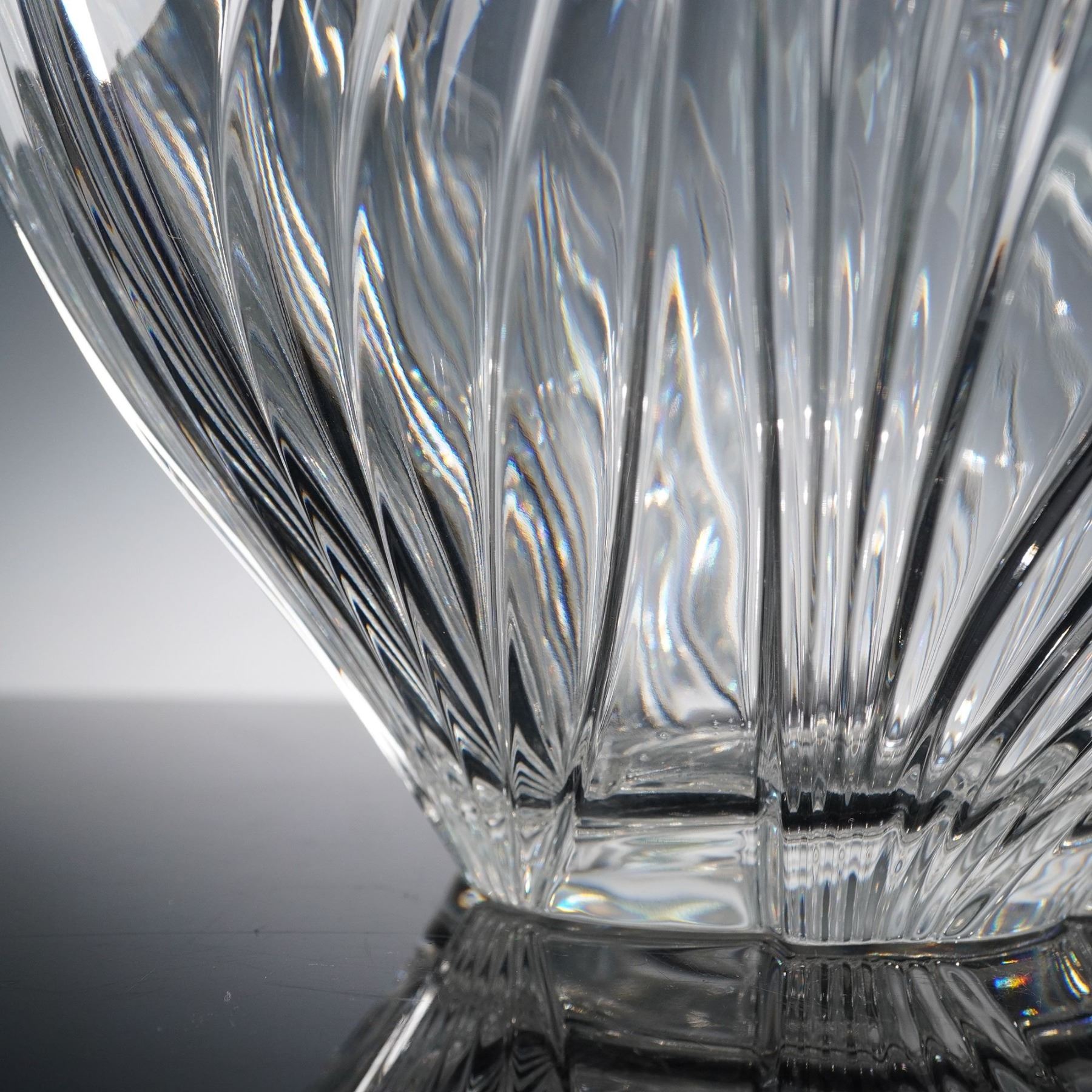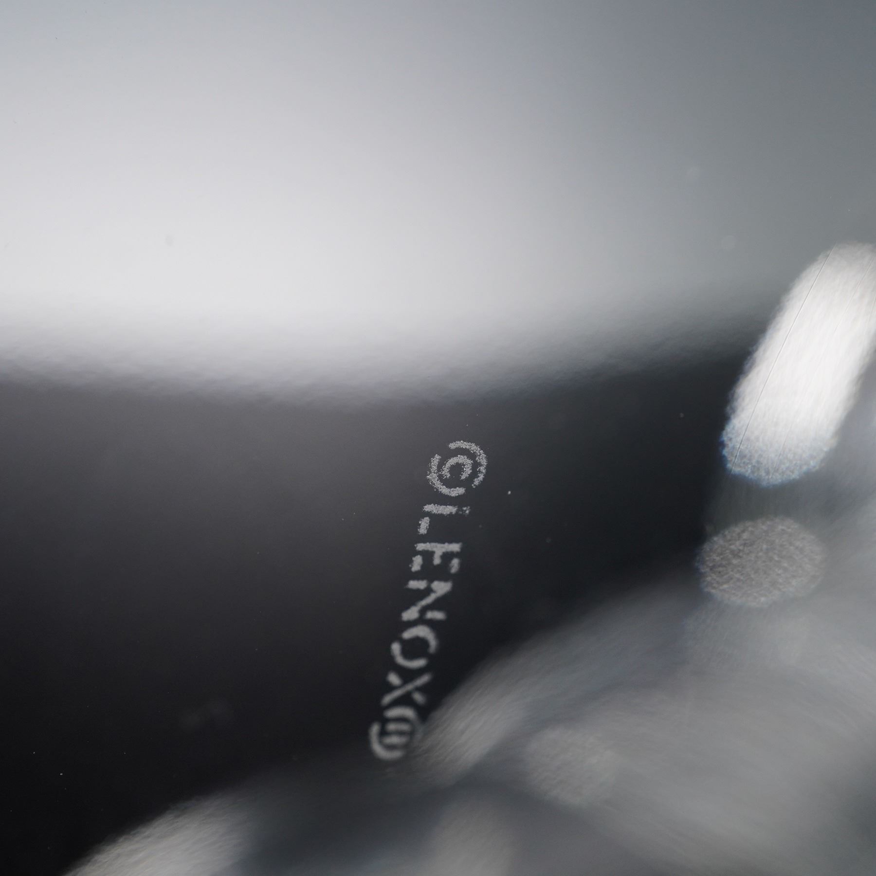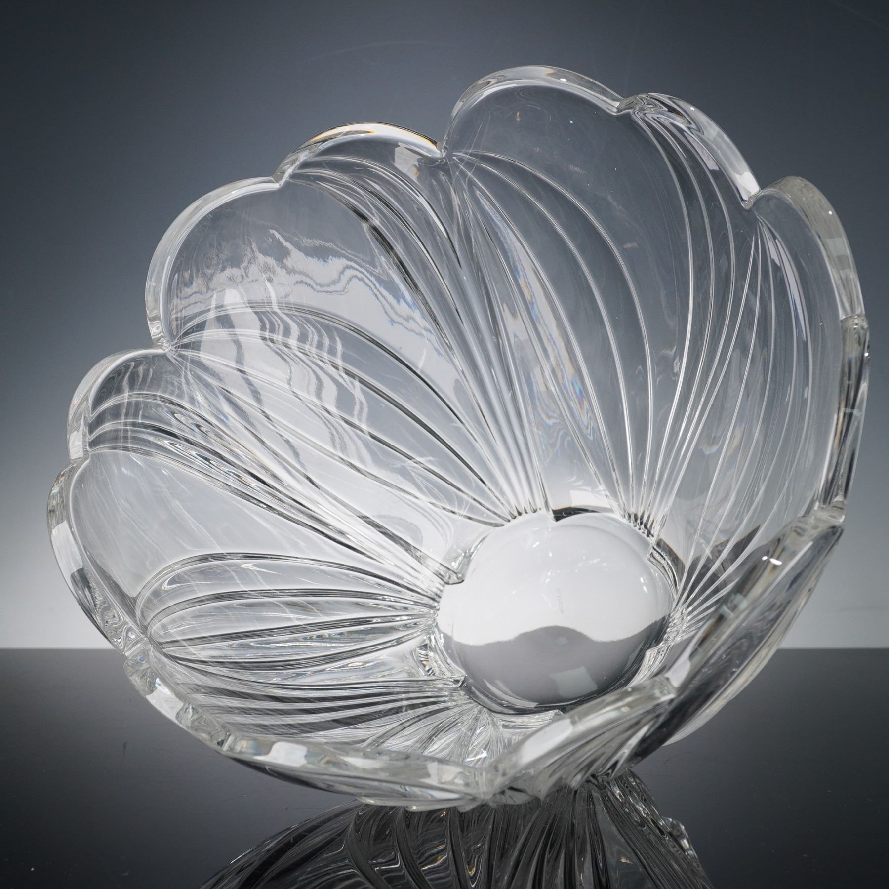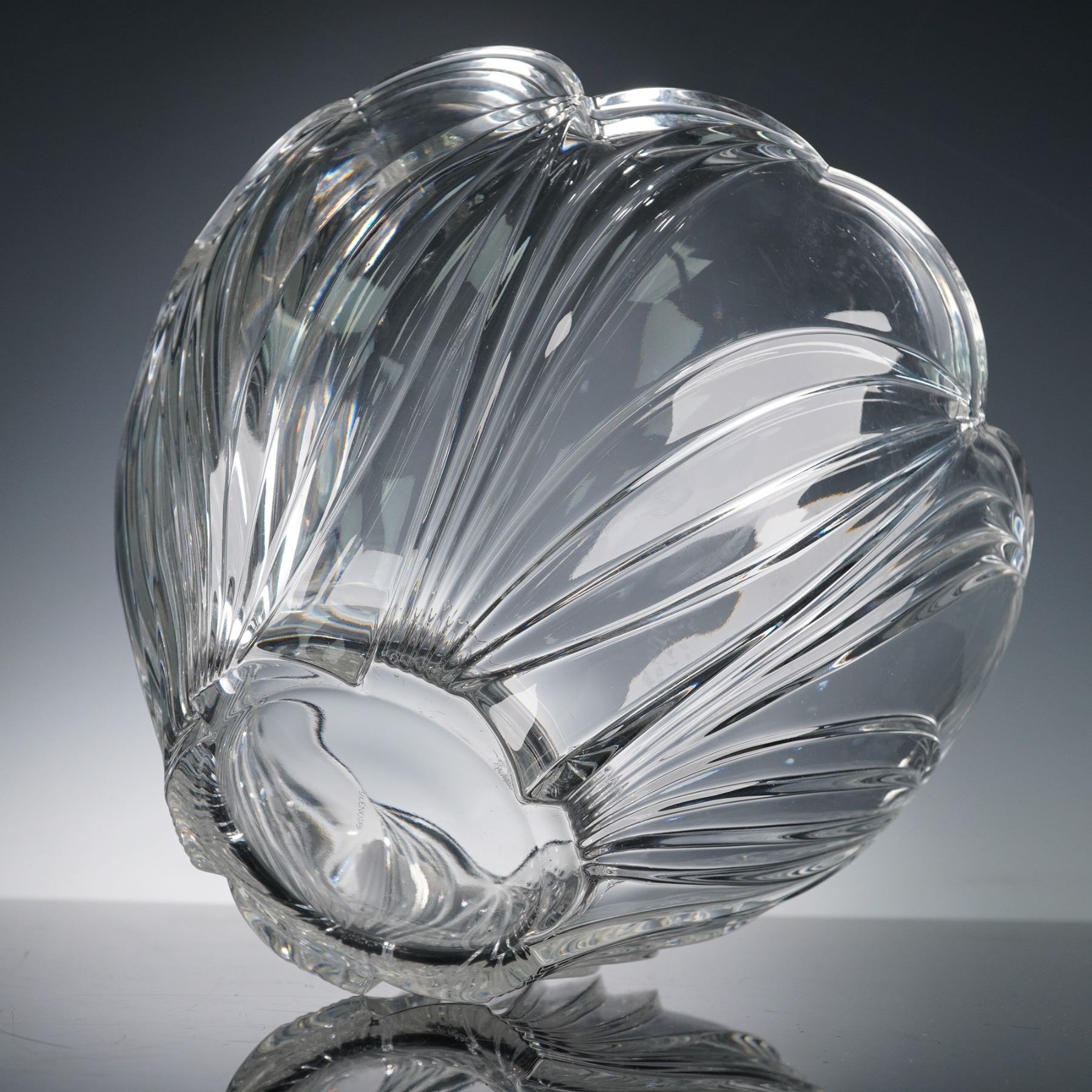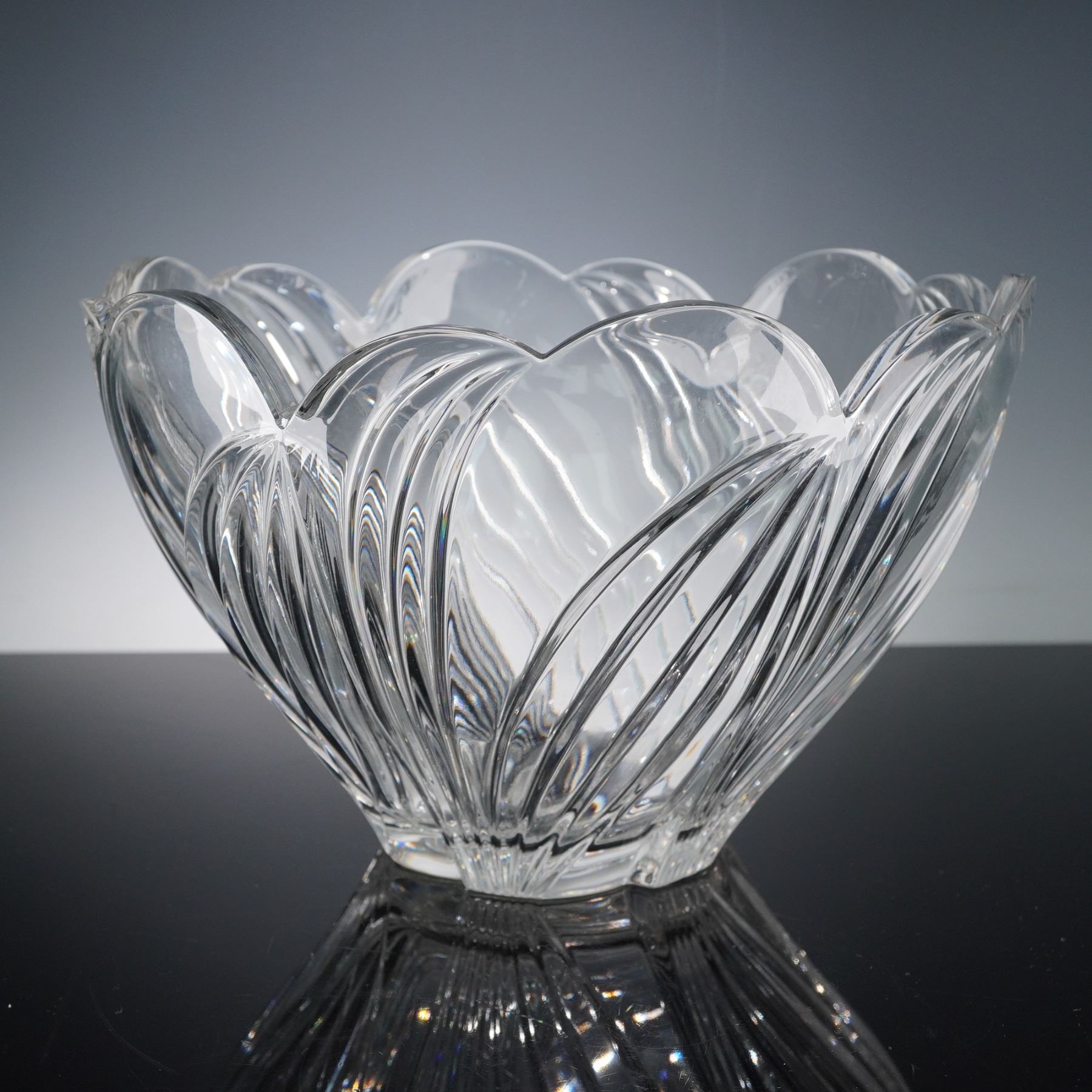 A clear crystal serving bowl featuring a swirl design that radiates from the base and extends upward into scalloped edges. Signed on the base with the Lenox hallmark.