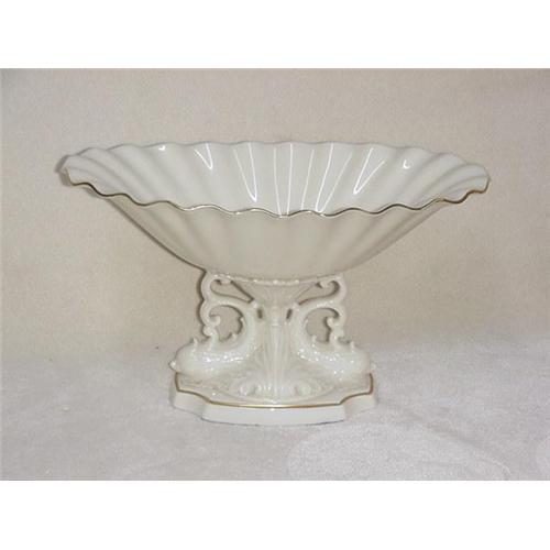 A very nice Lenox china centerpiece bowl, 12" long, 6 1/2" wide, 6 3/4" tall. Scalloped dish sits atop a dolphin base with gold trim.