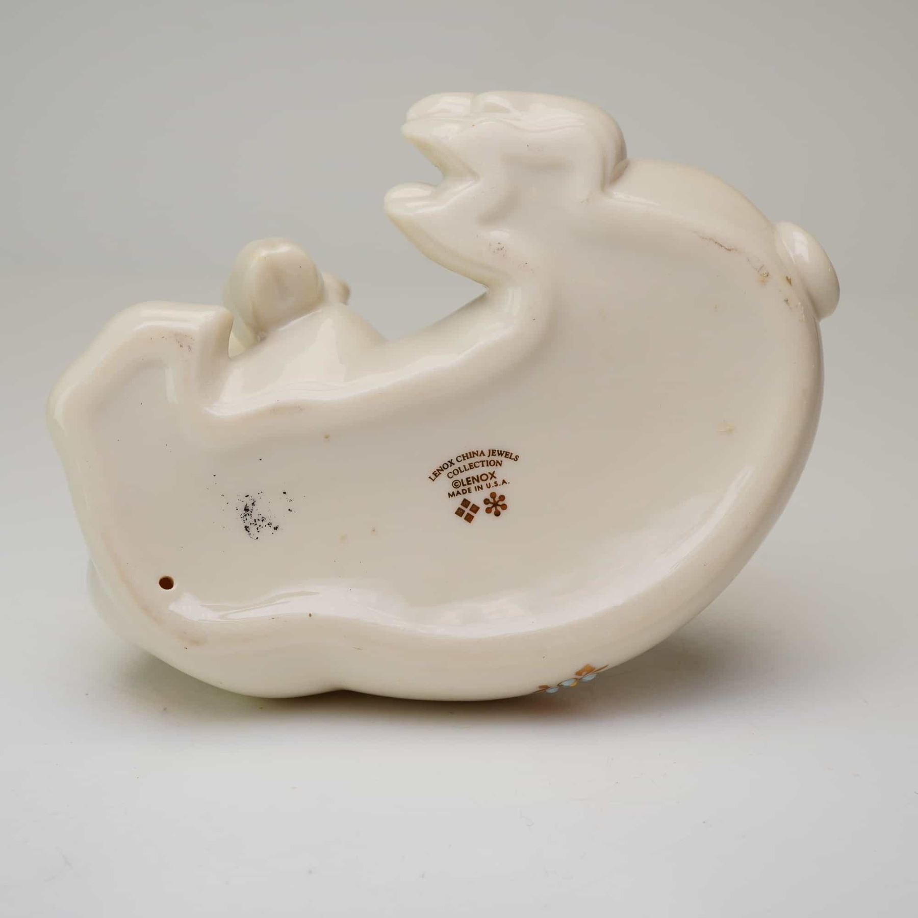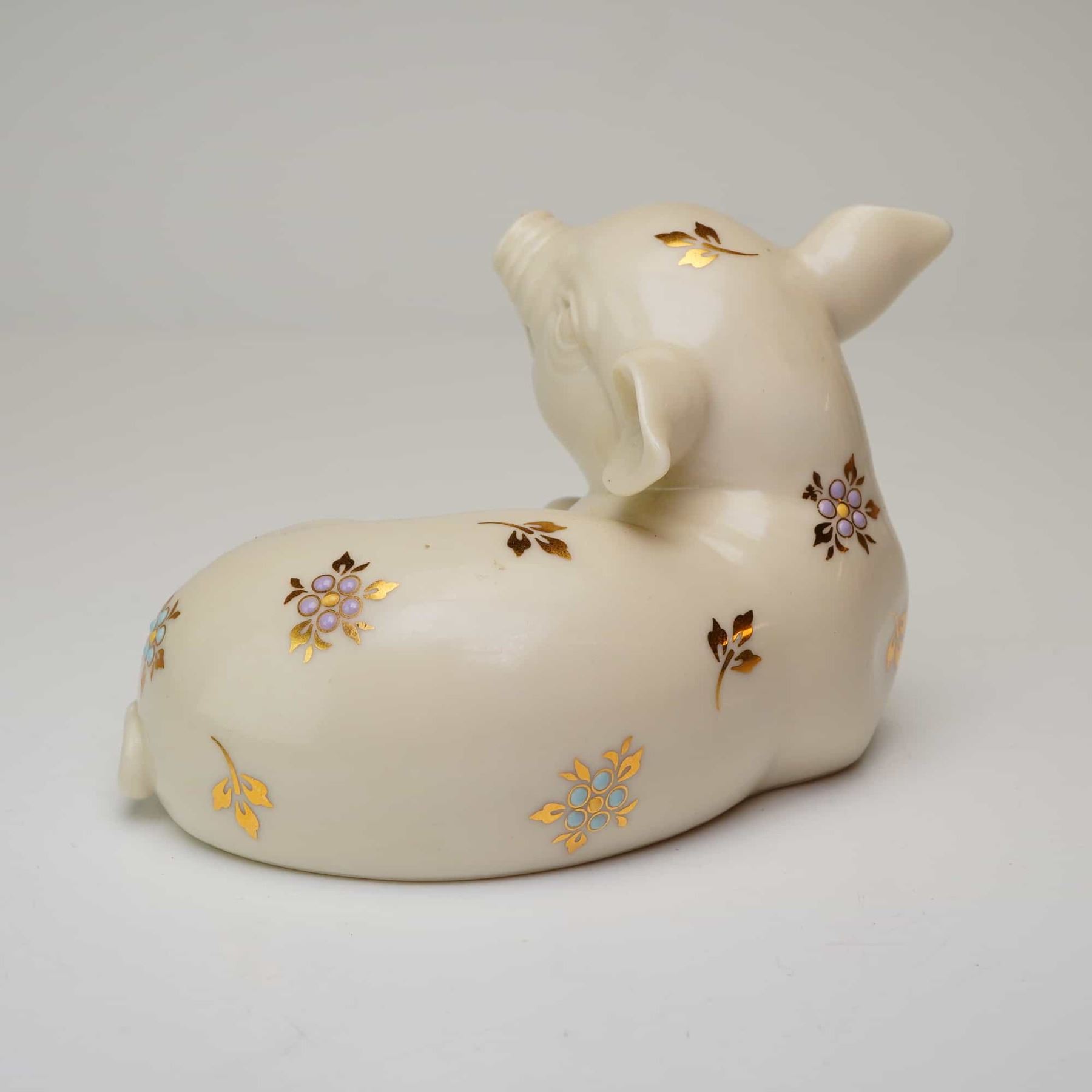 This stylized reclining pig is decorated with the signature China Jewels aesthetic, featuring hand-applied raised enamel dots in shades of lavender and light blue. The piece is further accented with 24-karat gold-leaf floral and foliate motifs scattered across the body. The underside features the official gold backstamp reading Lenox.