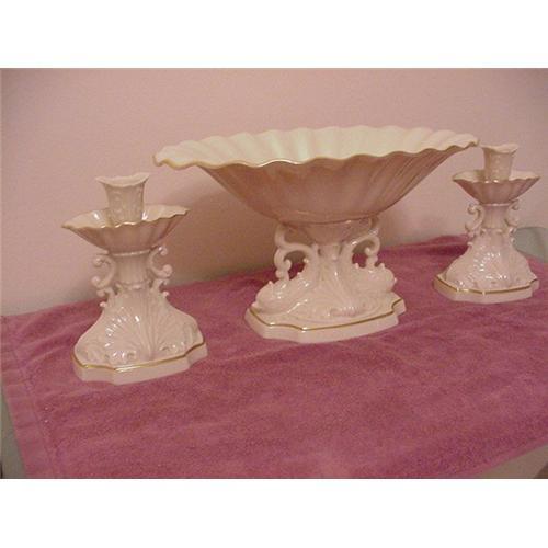 Three piece Lenox console set. A nice addition to any Lenox collection. Footed bowl measures 6 1/2" high and 12" wide. The bowl is resting on the upturned tails of two dolphin on the base. Candlesticks measure 6 inches high & 4 1/2 inches across at the base.