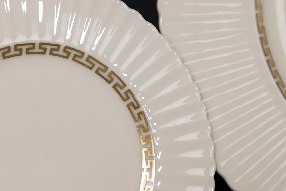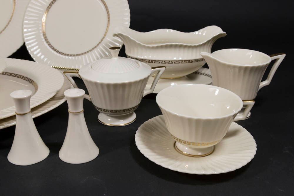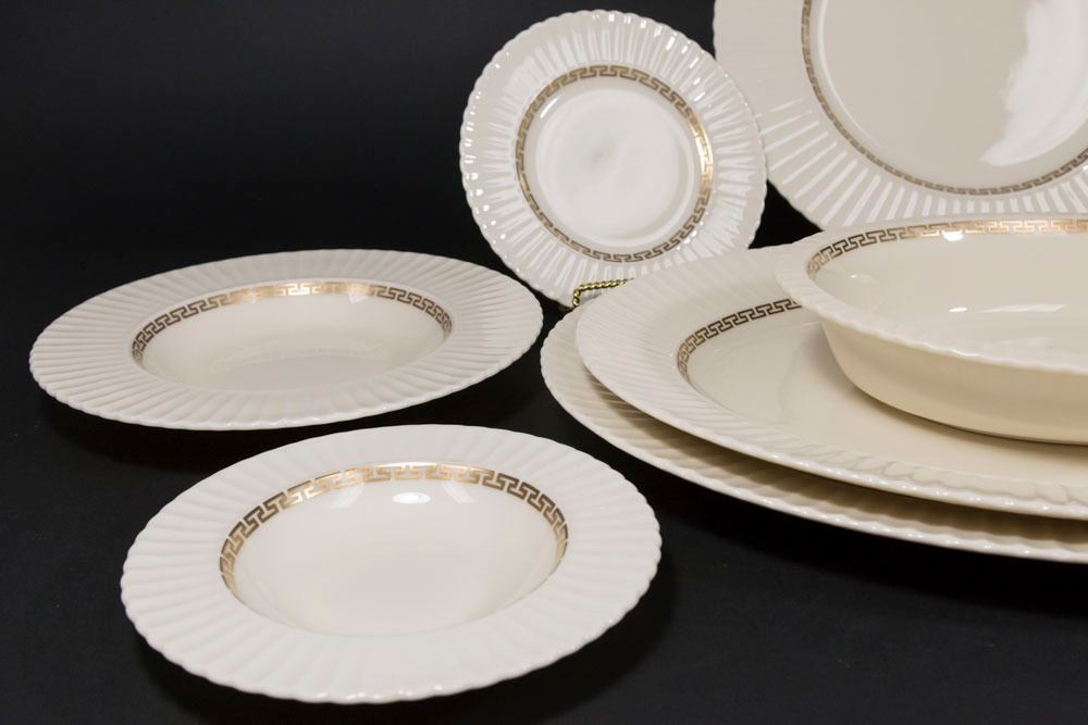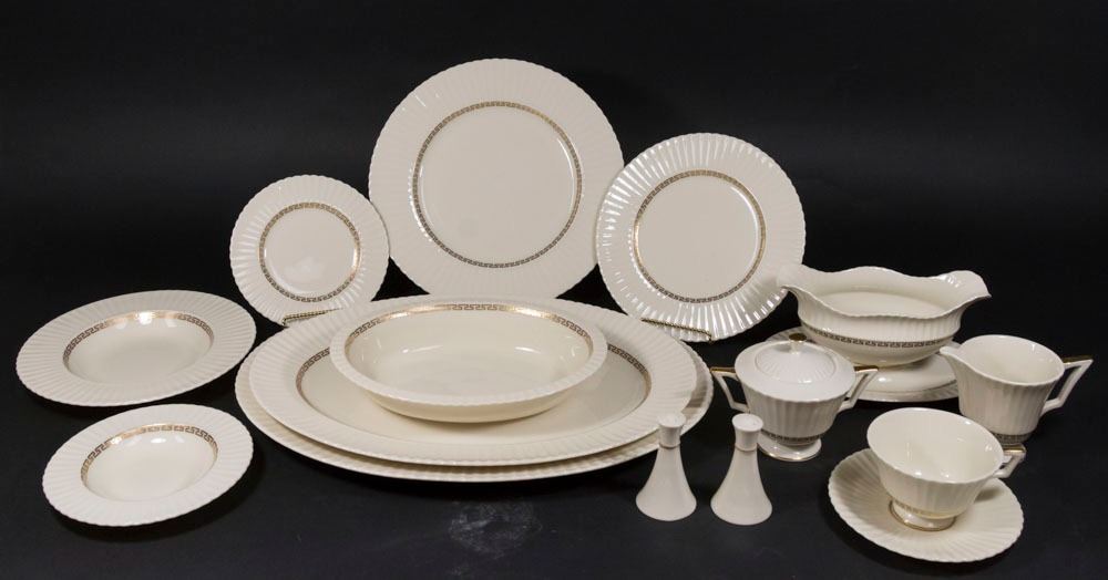 Including 16 dinner plates, 16 salad plates, 16 cups & 15 saucers, 12 soup bowls, 2 platters, 2 vegetable bowls, sugar & creamer, sauce boat, salt & pepper, 12 berry bowls, and 16 desserts.