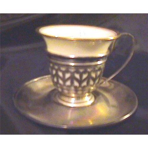 This is a very nice set of 6 Lenox Belleek demi tasse cups. The liners are white with gold trim and set in a sterling silver holder. The saucers are also sterling silver. The mark on the bottom is a green wreath with an 'L' in the middle with 'Lenox' printed underneath.